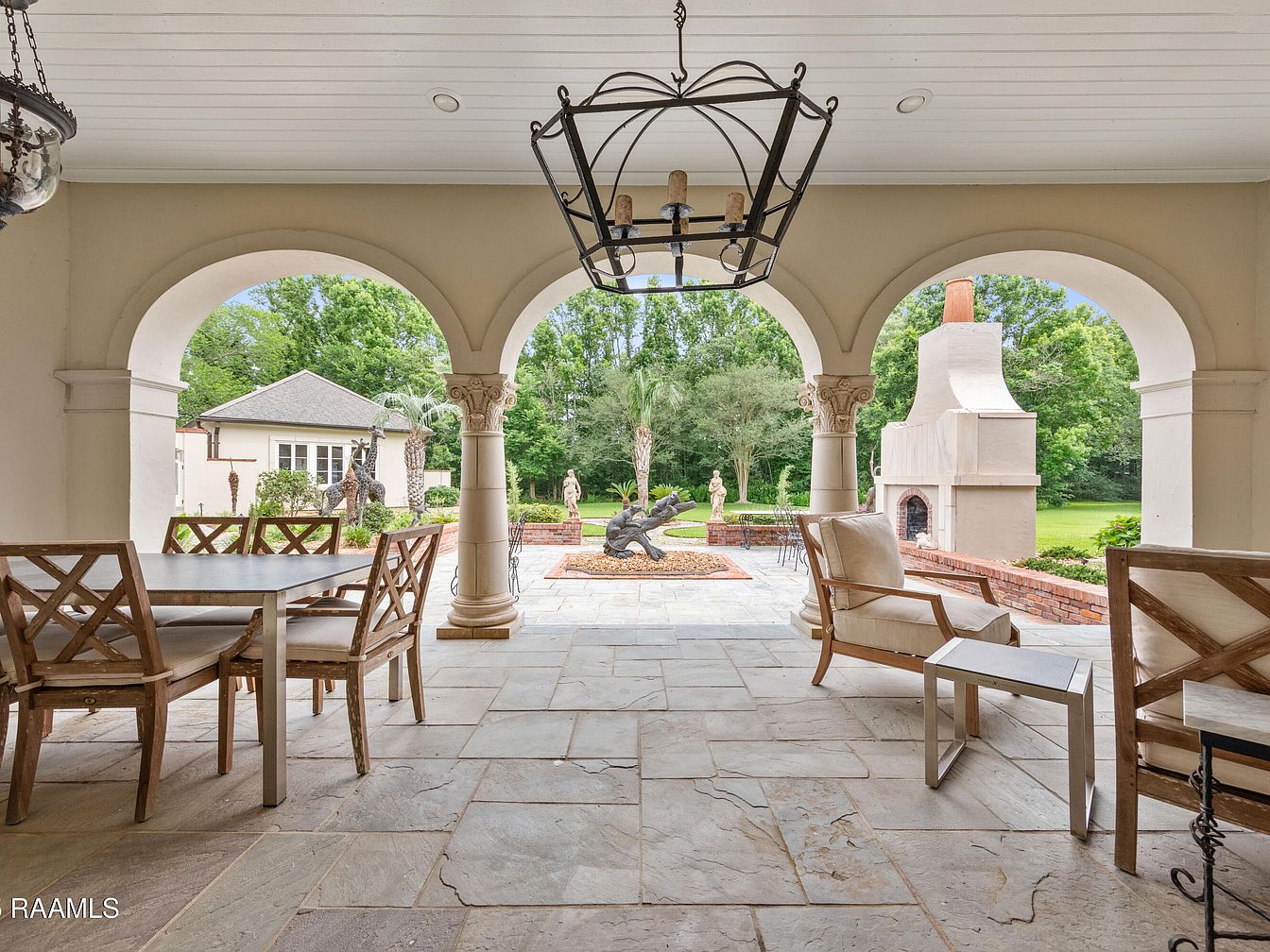 This inviting covered patio features elegant arched entryways, stone flooring, and stylish outdoor furniture that encourages relaxation. The generous seating arrangements are perfect for family gatherings, while the rustic wooden dining table offers a charming dining experience al fresco. A stunning outdoor fireplace serves as a focal point, enhancing the cozy ambiance and providing warmth for cooler evenings. The color palette combines earthy tones with natural wood finishes, beautifully contrasting with the lush greenery visible through the arches. Sculptural details and manicured landscaping add an artistic touch, making it a perfect space for entertaining and enjoying nature.