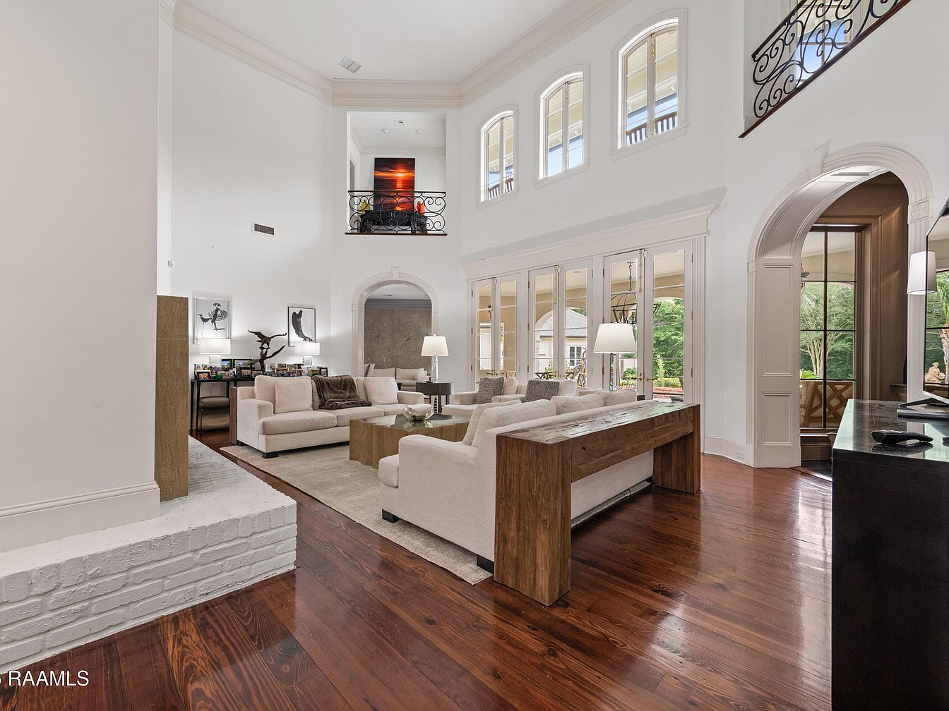 This inviting living room exudes sophistication with its high ceilings and expansive layout, framed by large windows that flood the space with natural light. The soft, neutral color palette of beige and white creates a calming atmosphere, complemented by rich wooden flooring. A cozy arrangement of plush, contemporary sofas surrounds a sleek coffee table, fostering a welcoming environment for family gatherings. Architectural details, including the graceful arches and elegant crown molding, enhance the room’s charm. A stylish stone fireplace serves as a striking focal point, while tasteful decor adds warmth and personality, making it an ideal space for relaxation and entertainment.