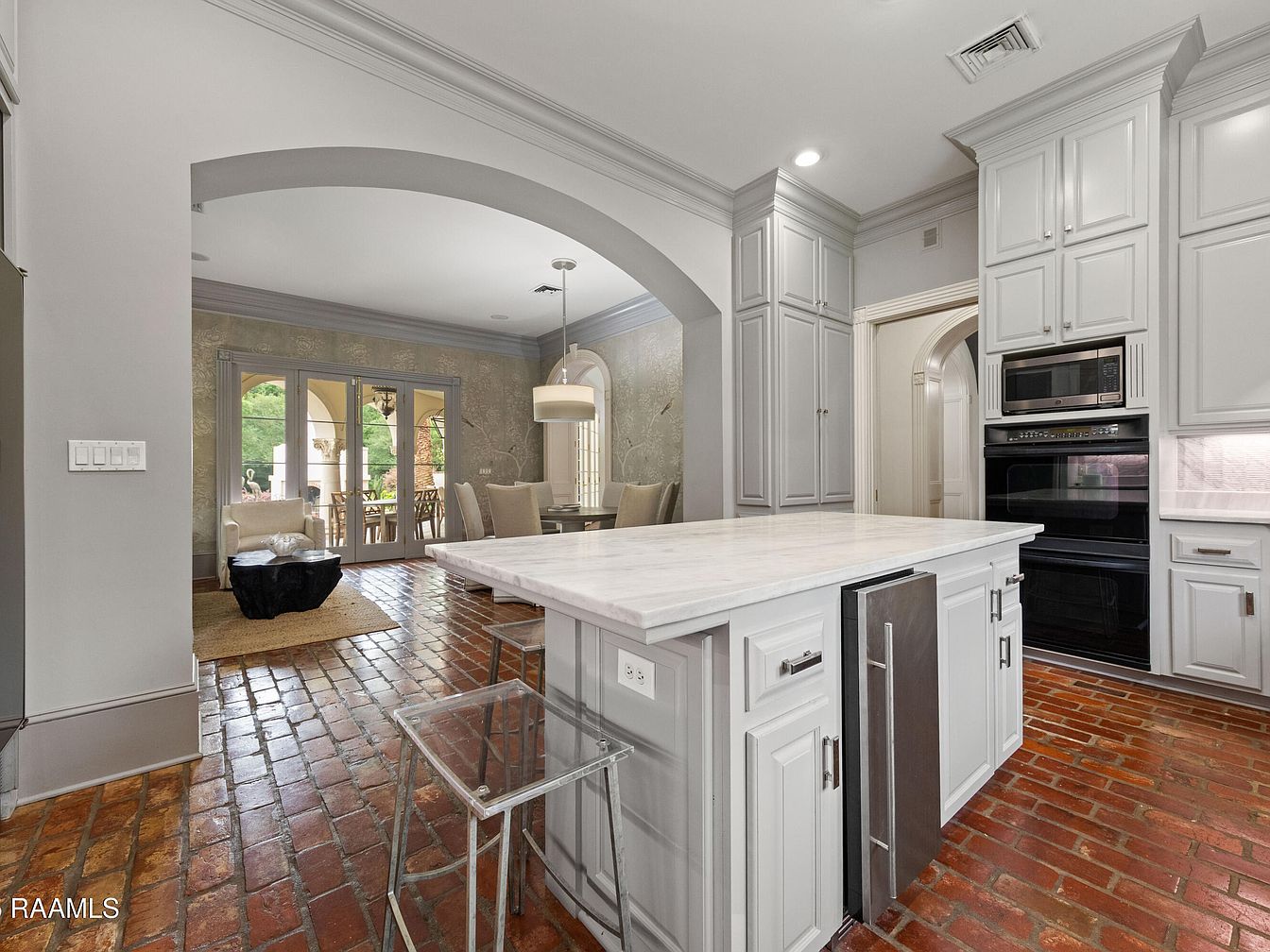 This contemporary kitchen seamlessly blends elegance with functionality. The spacious layout features a central marble island, perfect for meal prep and casual gatherings. Warm, rustic brick flooring complements the soft gray cabinetry, creating a cozy yet modern atmosphere. High-end appliances are integrated into the design, enhancing efficiency for family cooking. Natural light floods in from the adjacent dining area, highlighted by arched doorways, further promoting an open and inviting feel. Stylish accents like the unique light fixtures and the textured wall design provide visual interest, making this kitchen not only a culinary space but a family hub.