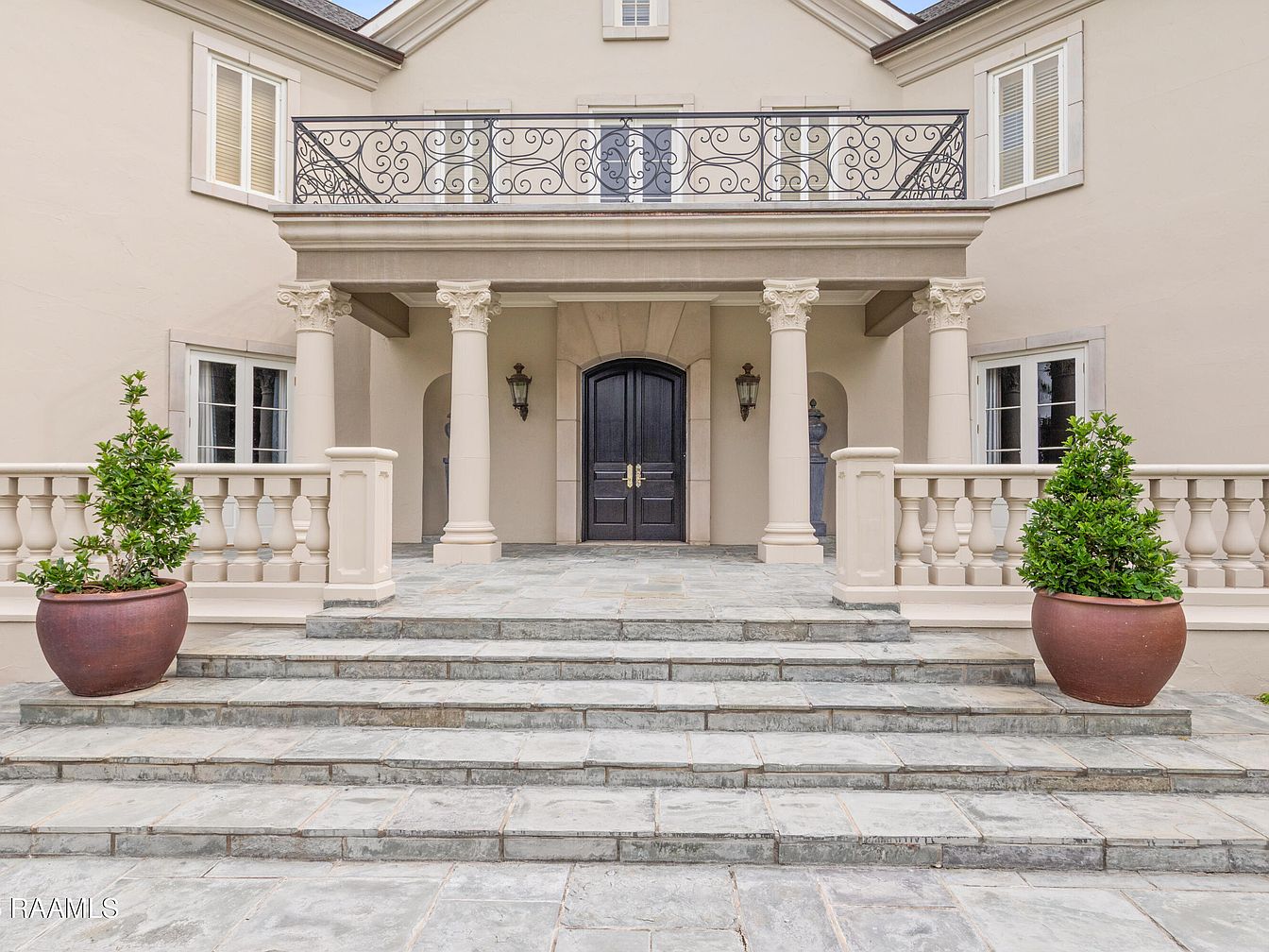 This grand entryway showcases a blend of classical elegance and modern functionality. Stone steps lead up to a luxurious double door, framed by ornate columns that provide a stately feel. The gentle curve of the balcony above adds architectural interest, with intricate wrought iron railings enhancing the sophistication. Lush potted greenery brings a touch of nature, creating a welcoming atmosphere. Natural stone flooring adds texture and durability, perfect for family-friendly living. Subtle neutral tones on the walls and decorative details harmonize beautifully, while outdoor sconces provide ambient lighting, ensuring the entryway is both inviting and visually striking.