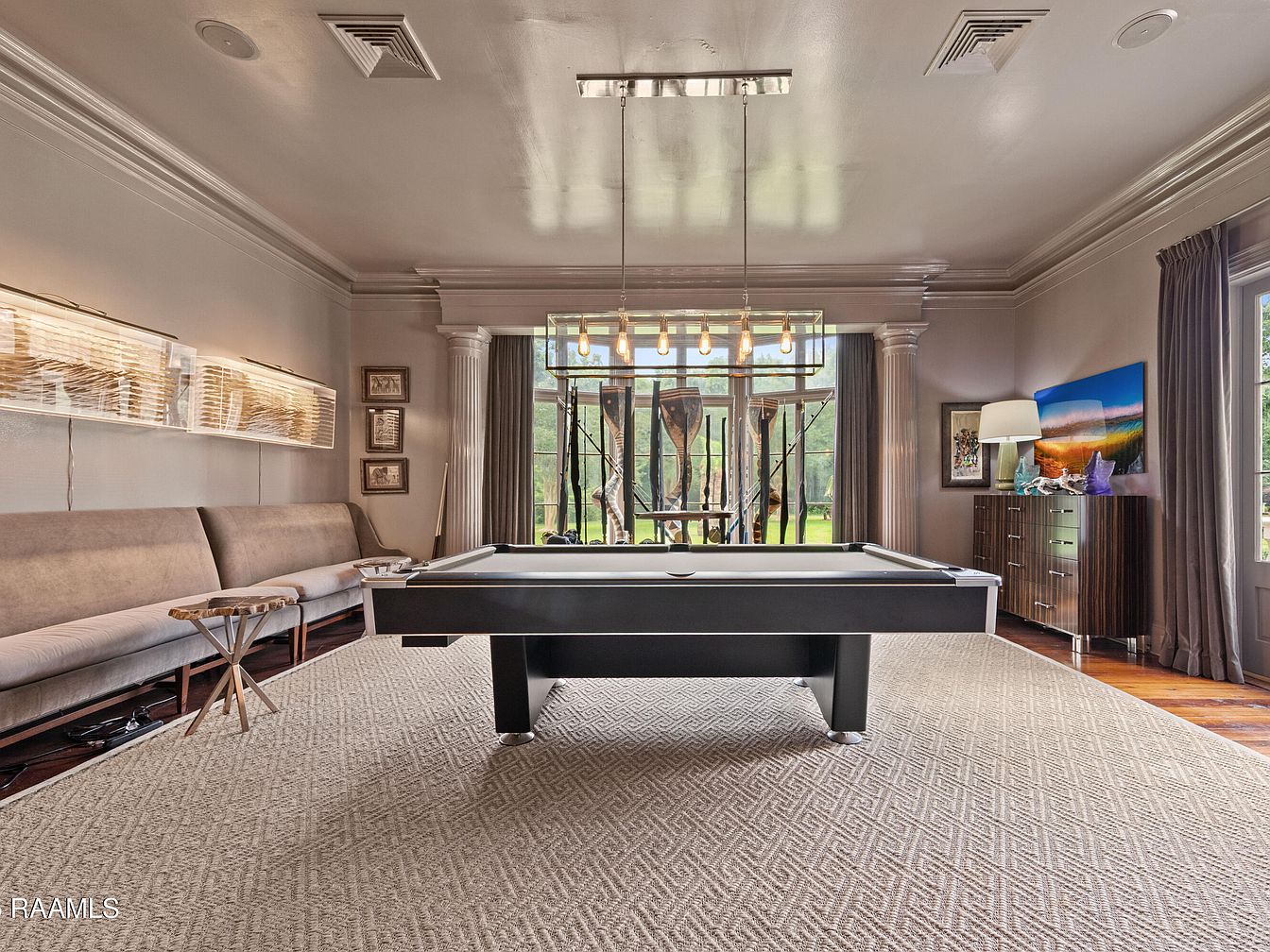 This sophisticated game room features a stunning pool table as the centerpiece, inviting friendly competition. Soft, neutral tones dominate the walls, complemented by plush seating that encourages relaxation. A textured area rug underfoot adds warmth while the ceiling boasts stylish, modern lighting, enhancing the ambiance. Tall windows framed by elegant drapes allow natural light to flow, revealing a picturesque outdoor view. Architectural details, including classic columns and sleek furniture, create a balance between traditional and contemporary styles. Thoughtfully placed decor pieces add character, showcasing a blend of comfort and elegance, perfect for family gatherings and entertaining.