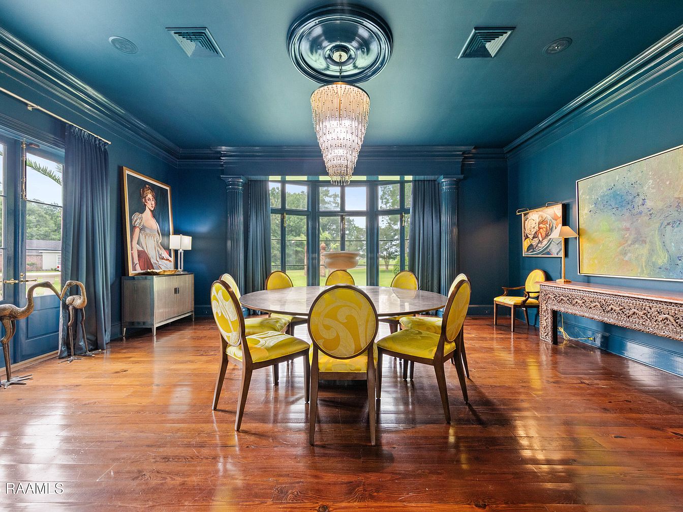 A stunning dining room blends sophistication with family-friendly charm. The bold navy walls create a rich backdrop for the round wooden table, surrounded by chairs featuring vibrant yellow upholstery that adds a playful touch. A striking crystal chandelier hangs overhead, illuminating the space with elegance. The hardwood flooring offers a warm contrast to the cooler wall tones, while large windows invite natural light and connect the room with the outdoors. Stylish artwork adorns the walls, enriching the aesthetic, while a carved sideboard and a tasteful lamp complete the design, perfect for hosting memorable gatherings.