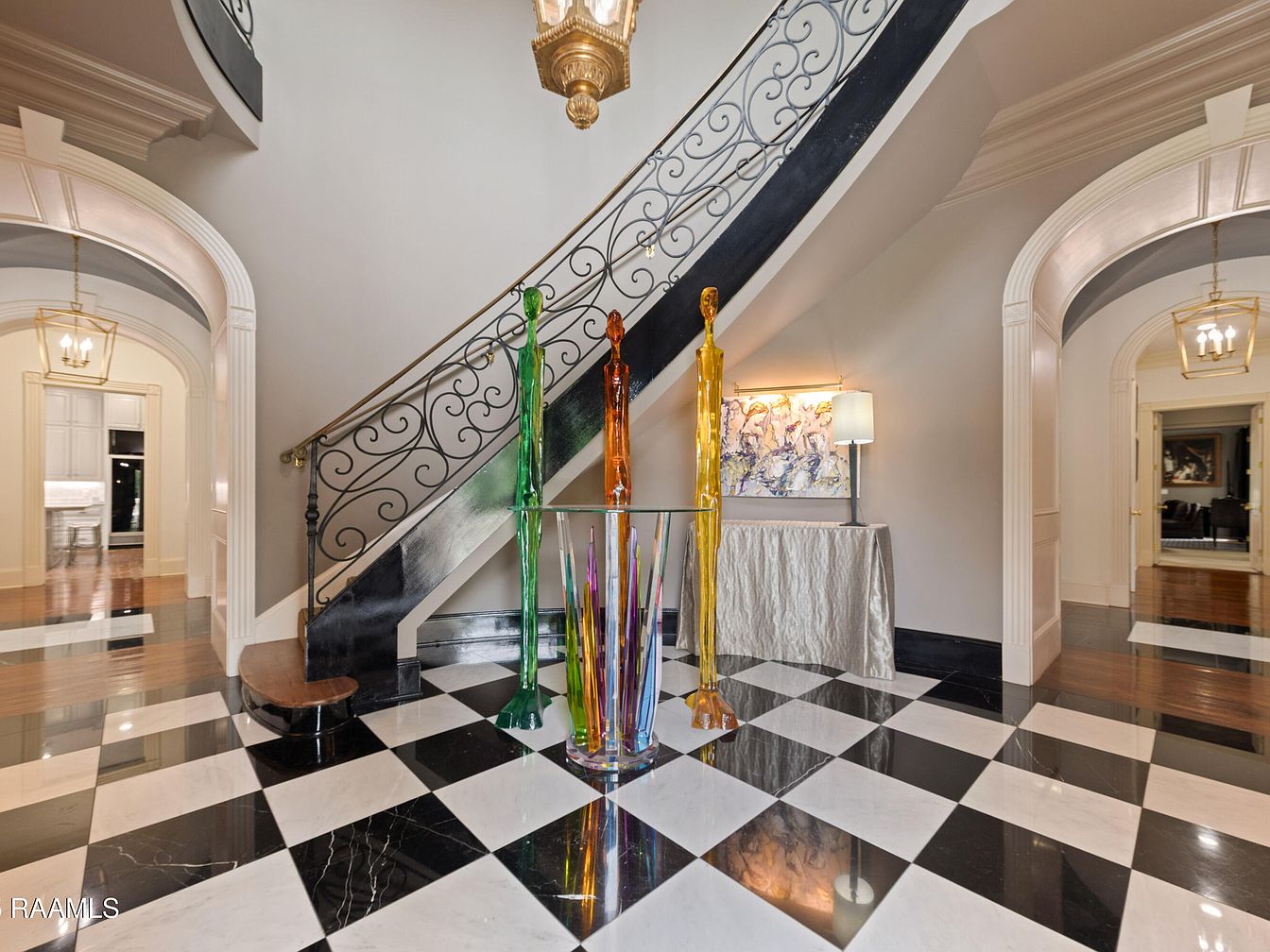 This striking foyer boasts a grand staircase, showcasing intricate wrought iron railings that elevate the space’s sophistication. A bold black and white checkered floor creates a dramatic entrance, complemented by the warmth of rich wood tones visible in adjacent areas. The layout incorporates a modern artistic touch, featuring vibrant glass sculptures that draw the eye and enhance the atmosphere. Soft lighting from elegant fixtures casts a welcoming glow, highlighting the subtle grey walls. With thoughtful design elements, this area combines elegance and family-friendly functionality, setting a refined yet inviting tone for the entire home.