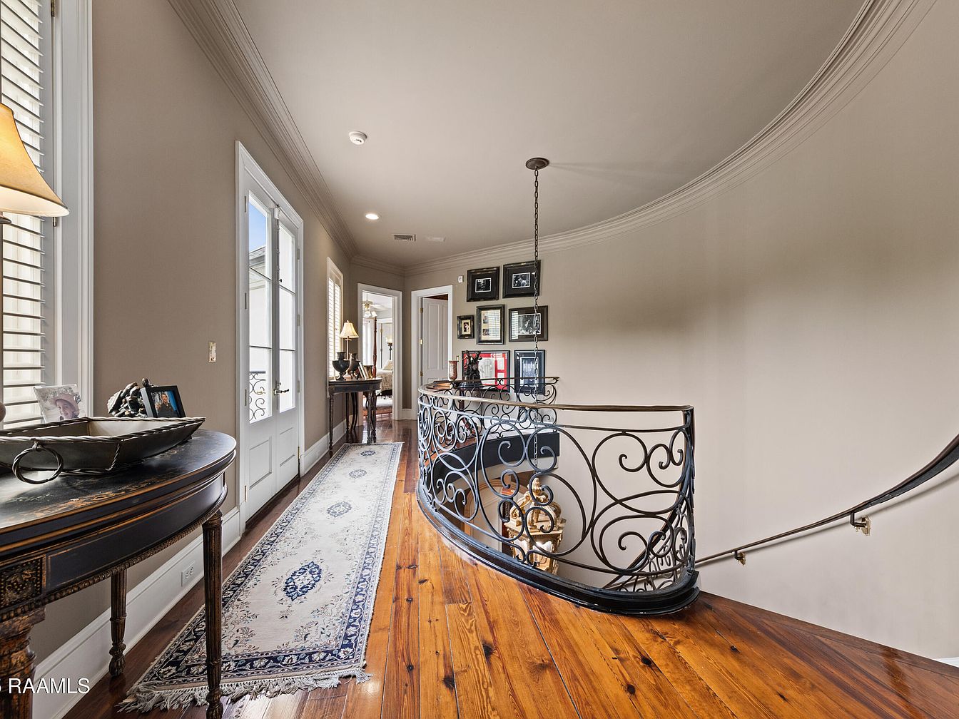 This elegant staircase landing combines functionality with refined aesthetics, creating a welcoming transition space. Rich, polished wooden flooring contrasts beautifully with the soft, neutral paint on the walls, enhancing the airiness of the area. A decorative wrought-iron railing adds an artistic touch, echoing classic design principles. Sunlight streams through multiple windows, illuminating family photos displayed proudly along the walls. A tasteful console table, adorned with a lamp, offers both style and practical space for decor. This design promotes a cozy atmosphere, making it perfect for family gatherings while maintaining an inviting flow to the adjoining rooms.