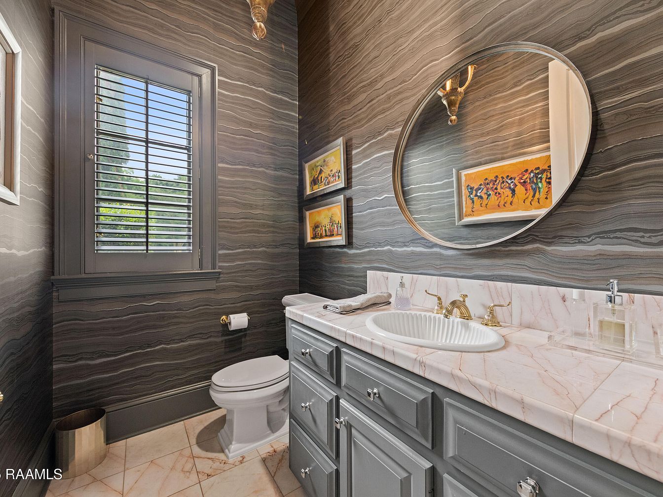 This elegant half bath showcases a stunning blend of modern design and classic charm. The striking marbled wallpaper, in shades of gray, creates a dramatic backdrop, perfectly complemented by the sleek gray cabinetry. A sophisticated white marble countertop with a subtle pink hue adds luxury to the space, while the circular mirror reflects light and enhances the room’s openness. Warm metallic accents from the fixtures introduce a touch of glamour. A window with plantation shutters allows natural light to filter in, while framed artwork brings personality. The polished marble flooring unifies the design, making this half bath both functional and visually captivating.
