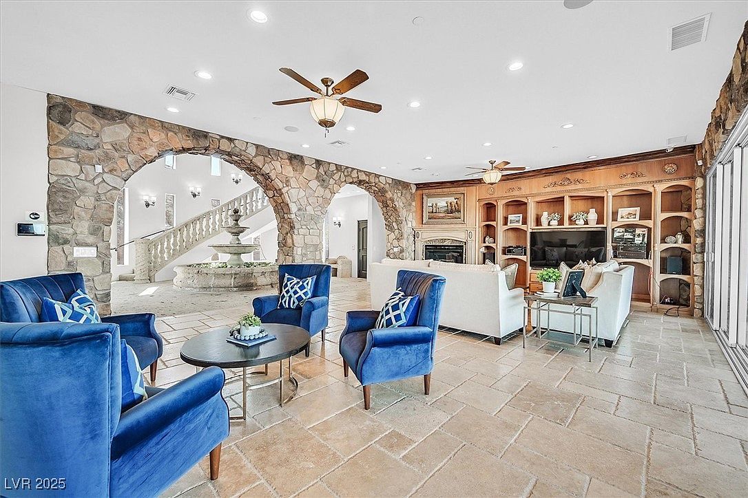 Spacious living room with striking stone archways creates an inviting and grand ambiance ideal for family gatherings. The room features a classic stone-tiled floor, complementing the natural stone walls and arches that open to a staircase and water fountain, blending indoor and outdoor elements. Cozy white sofas paired with four plush royal blue armchairs provide comfortable seating, while a large wooden built-in unit, complete with shelving and a fireplace, offers both storage and display space. The neutral palette is warmed by wood accents and vibrant blue upholstery, perfect for both adults and children to relax or entertain guests.