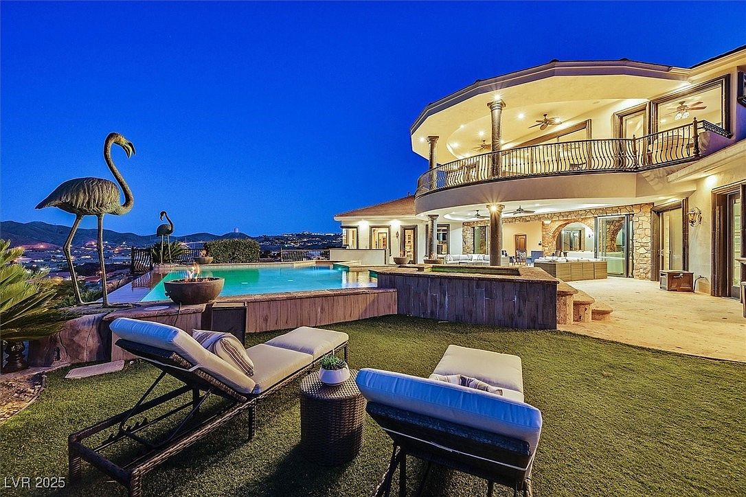 An inviting poolside lounge area seamlessly blends relaxation with breathtaking mountain and city views. Two cushioned chaise lounges are set atop manicured turf, inviting family members to unwind or watch children play. Metal flamingo sculptures add whimsical charm, while the infinity pool creates a seamless transition to the landscape beyond. The home’s architecture features a spacious upper balcony and a covered stone patio, ideal for gatherings and outdoor dining. Warm, earthy tones of the exterior, ambient lighting, and natural materials establish a luxurious yet family-friendly atmosphere perfect for entertaining or peaceful evenings under the stars.
