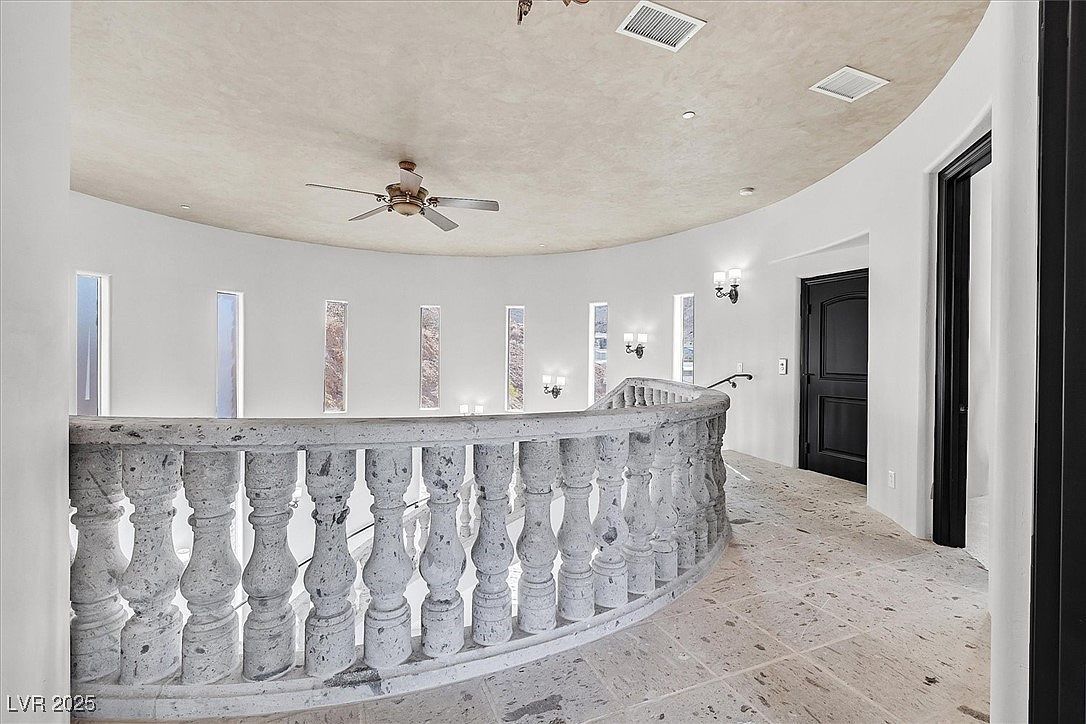 Sweeping curves define this airy upstairs balcony hallway, featuring a dramatic balustrade with carved stone details and a light travertine floor that brightens the space. The circular layout draws the eye to a series of tall, narrow windows set against soft white walls, filling the area with natural light while maintaining privacy. Classic wall sconces add elegance and provide warm illumination, making the hallway both stylish and inviting. The ceiling fan offers comfort for families on warmer days, and the wide, open layout allows children to move freely and safely between rooms while maintaining a sense of grandeur in this transitional space.
