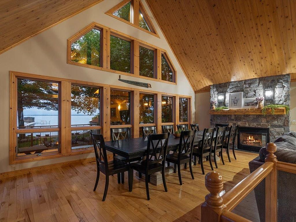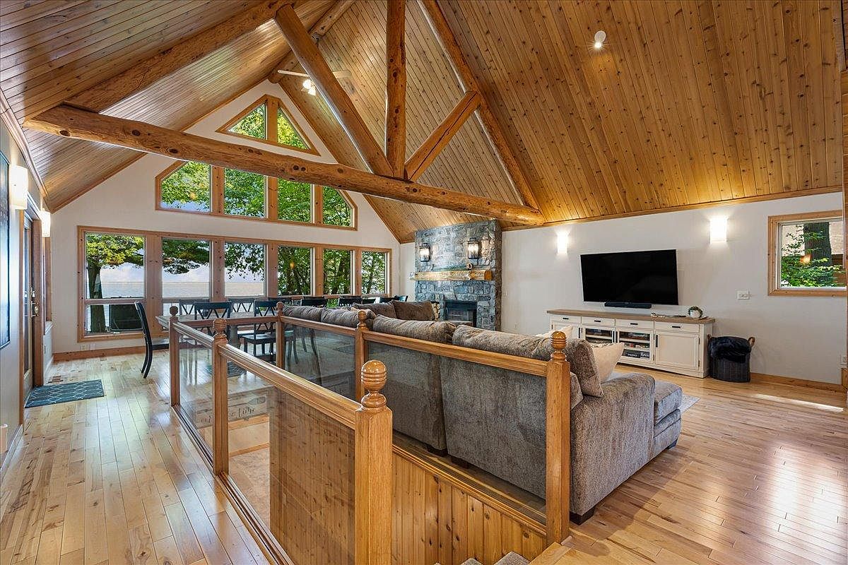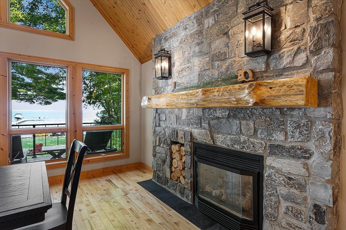 Warmth and rustic elegance define this cozy living area, featuring a striking floor-to-ceiling stone fireplace capped with a thick, polished log mantel. Natural wood floors and knotty pine ceilings complement the rugged stonework, creating a lodge-like atmosphere that feels inviting for families and guests alike. Large windows framed in natural wood flood the space with daylight and provide breathtaking views of the lake and patio, blending indoor and outdoor living. Black metal lantern sconces and a sturdy hearth add contemporary charm, while the ample seating area ensures comfort and togetherness for gatherings or quiet evenings by the fire.