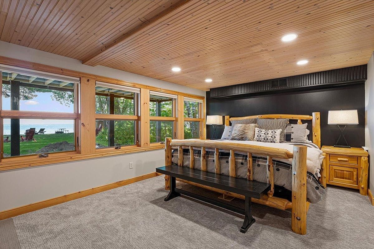 Expansive windows fill this cozy bedroom with natural light and frame serene lake views, creating a tranquil retreat ideal for families. The space features a warm, rustic aesthetic with light wood paneling on the ceiling and trim that pairs beautifully with the sturdy log bed and matching nightstands. A soft, neutral carpet adds comfort underfoot, while modern recessed lighting ensures brightness throughout. The décor is anchored by plush textiles in various grays and blacks, complimented by simple geometric lamps. The intimate and nature-inspired design makes it a perfect sanctuary for relaxation and family bonding.