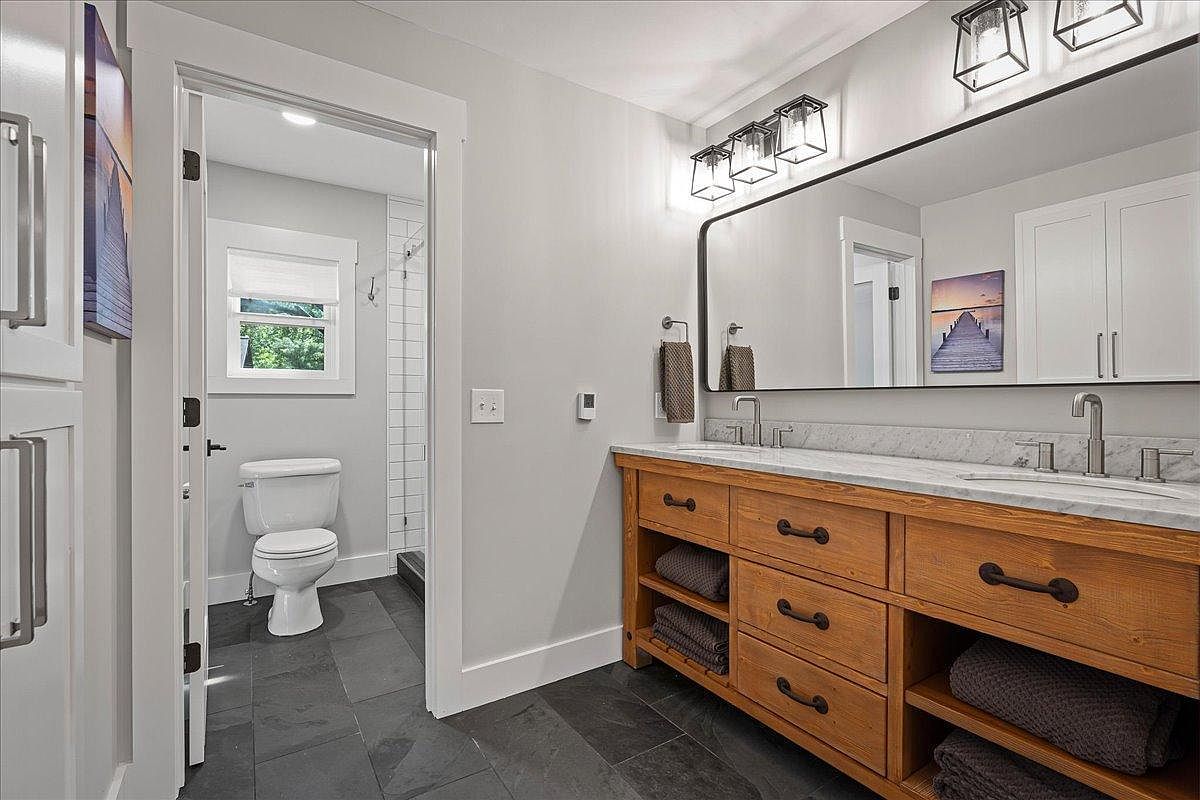 A spacious bathroom vanity area features a double sink set against a sleek marble countertop, ideal for busy mornings. The large, warmly finished wood vanity offers ample storage with drawers and open shelving stocked with soft, rolled towels, encouraging family convenience. Overhead, three modern light fixtures provide bright, clear illumination for daily routines. The color palette balances soft white and grey tones on the walls and slate floor, lending a calm, clean feel. The adjacent water closet and shower are easily accessible, making this layout perfect for families needing both privacy and shared functionality. Decorative touches include minimalist wall art and sturdy contemporary hardware.