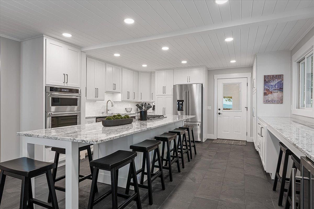 A bright and spacious kitchen features an expansive island with sleek marble countertops and comfortable black stools, perfect for family gatherings or casual meals. Crisp white cabinetry paired with modern stainless steel appliances provides ample storage and a clean, organized appearance. Recessed lighting and classic beadboard ceiling panels add warmth and sophistication, while large windows and glass-paneled doors flood the space with natural light. The thoughtful layout maximizes both working space and seating, making it ideal for meal prep and entertaining. With durable finishes and plenty of room for everyone, this kitchen is both practical and welcoming for busy family life.