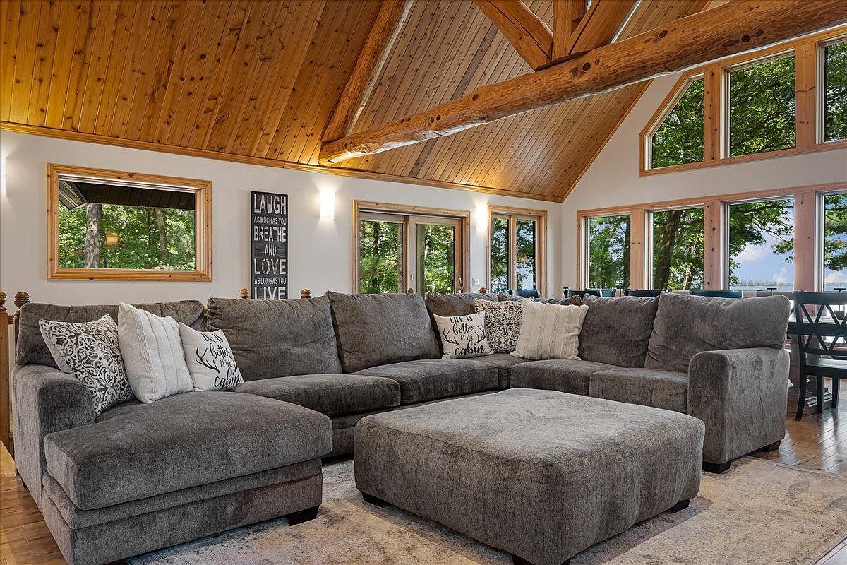 A spacious and inviting living room with a soaring cathedral ceiling finished in warm tongue-and-groove wood that contrasts beautifully with crisp white walls. Large windows bring in an abundance of natural light and offer serene views of the surrounding trees, creating a seamless blend of indoor comfort and outdoor beauty. The plush gray sectional provides ample, family-friendly seating around a massive matching ottoman, ideal for gatherings or relaxation. Accented with patterned and texturized pillows, the cozy furniture sits on a neutral area rug. Wooden trim and exposed beams add rustic charm, while inspirational wall art enhances the welcoming, lived-in atmosphere.