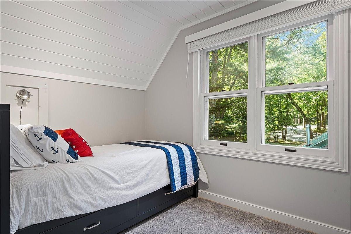 A bright and inviting bedroom features a built-in single bed with convenient storage drawers beneath, ideal for keeping toys or linens organized. The sloped, white-paneled ceiling adds architectural charm and a sense of comfort, while large windows fill the room with natural light and frame cheerful woodland views for a close-to-nature feel. The neutral gray walls are paired with soft carpeting, creating a calm, family-friendly atmosphere. Nautical-themed pillows and a striped blue blanket lend a playful touch, making the space perfect for children but comfortable enough for any guest. Functional wall lighting provides a cozy reading nook.