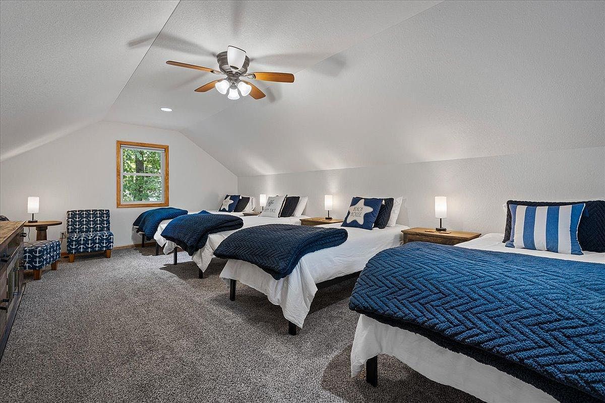 A bright and inviting attic-style loft bedroom features four twin beds lined up along a gently sloping ceiling, designed with comfort and practicality for families or guests. Soft gray carpeting underfoot enhances the cozy atmosphere, while crisp white walls and natural wood trim around the window create a fresh backdrop. Each bed has bold navy throws, striped or themed accent pillows, and its own nightstand with a modern lamp. Family-friendly touches include anchor-adorned armchairs, making it an ideal room for children or cousins to gather. The ceiling fan ensures comfort, while ample floor space encourages play and relaxation.