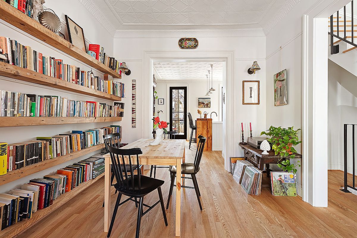 This inviting dining area features a harmonious blend of modern and rustic design elements. Natural light floods the space, highlighting the warm tones of the hardwood floor and the elegant wood shelving lined with books. A sturdy wooden table accompanied by black chairs promotes family gatherings, while the soothing color palette of whites and earthy tones creates a serene atmosphere. Decorative accents include stylish wall art and a flourishing plant, enhancing the homey feel. The open layout seamlessly connects to the kitchen, ensuring interaction and comfort during meals and conversations, making it an ideal space for creating lasting memories.