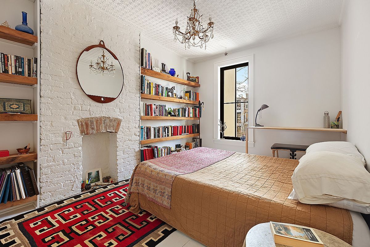 This cozy bedroom exudes warmth and charm with its blend of contemporary and vintage elements. The whitewashed brick wall serves as a striking backdrop for the round mirror and elegant chandelier overhead, adding a touch of sophistication. Built-in wooden shelves display an array of books, creating a personalized reading nook. A rich, patterned area rug anchors the room, providing comfort underfoot. The warm brown bedding contrasts beautifully with soft pillows, inviting relaxation. Natural light pours through the large window, illuminating the space and enhancing its airy feel. A minimalist desk offers a functional workspace, making it perfect for unfurling creativity.