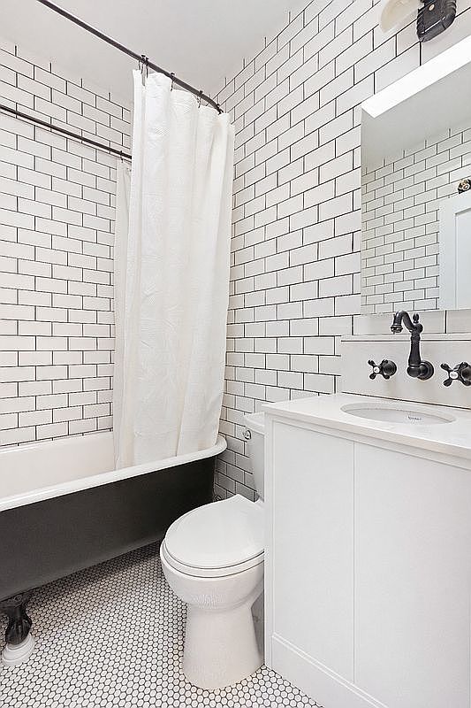This stylish bathroom features a classic combination of white subway tiles and a black freestanding bathtub, enhancing its contemporary charm. The checkerboard floor with black accents adds visual interest while ensuring a family-friendly space that’s easy to clean. A sleek white vanity complements the room, with polished black fixtures creating a striking contrast. Ample natural light is invited in through a strategically positioned mirror, making the space feel larger and brighter. The subtle use of textures, from the soft shower curtain to the refined tilework, creates an inviting atmosphere perfect for relaxation after a long day.
