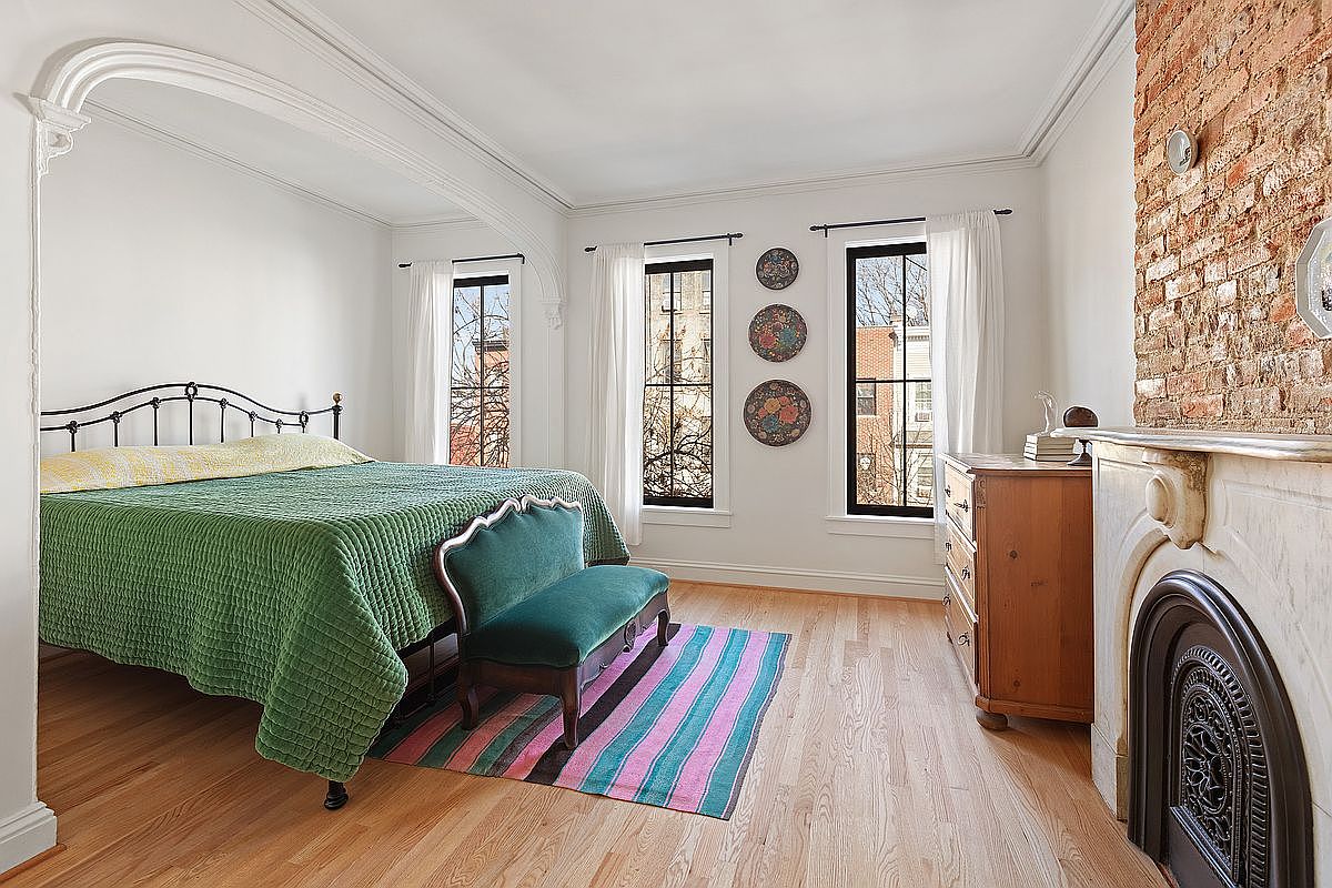 This inviting master bedroom boasts large windows adorned with white drapes, illuminating the space with natural light while providing serene views. The focal point is a stylish iron bed layered with a vibrant green quilt, harmonizing with the textured pink and blue striped area rug underneath. A comfortable velvet bench adds seating versatility, perfect for morning routines or relaxation. Elegant architectural details, including ornate crown molding and a charming exposed brick fireplace, enhance the room’s character. Warm wood flooring complements the minimalistic furniture, creating a cozy yet sophisticated atmosphere ideal for restful retreats and family gatherings.