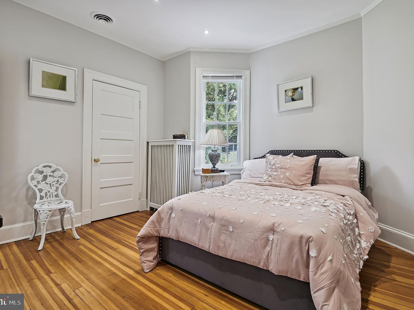 This inviting bedroom features a blend of modern comfort and classic charm. A plush queen-sized bed adorned with a soft pink, flower-embroidered duvet invites relaxation, while coordinated pillows add a touch of elegance. The warm, honey-toned hardwood floors enhance the room’s coziness. A vintage-style white chair rests against the wall, providing a perfect reading nook. Subtle gray walls create a soothing backdrop, complemented by carefully placed artwork that adds character without overwhelming the senses. Large windows bathe the space in natural light, creating a serene ambiance, making this room an ideal family-friendly retreat.