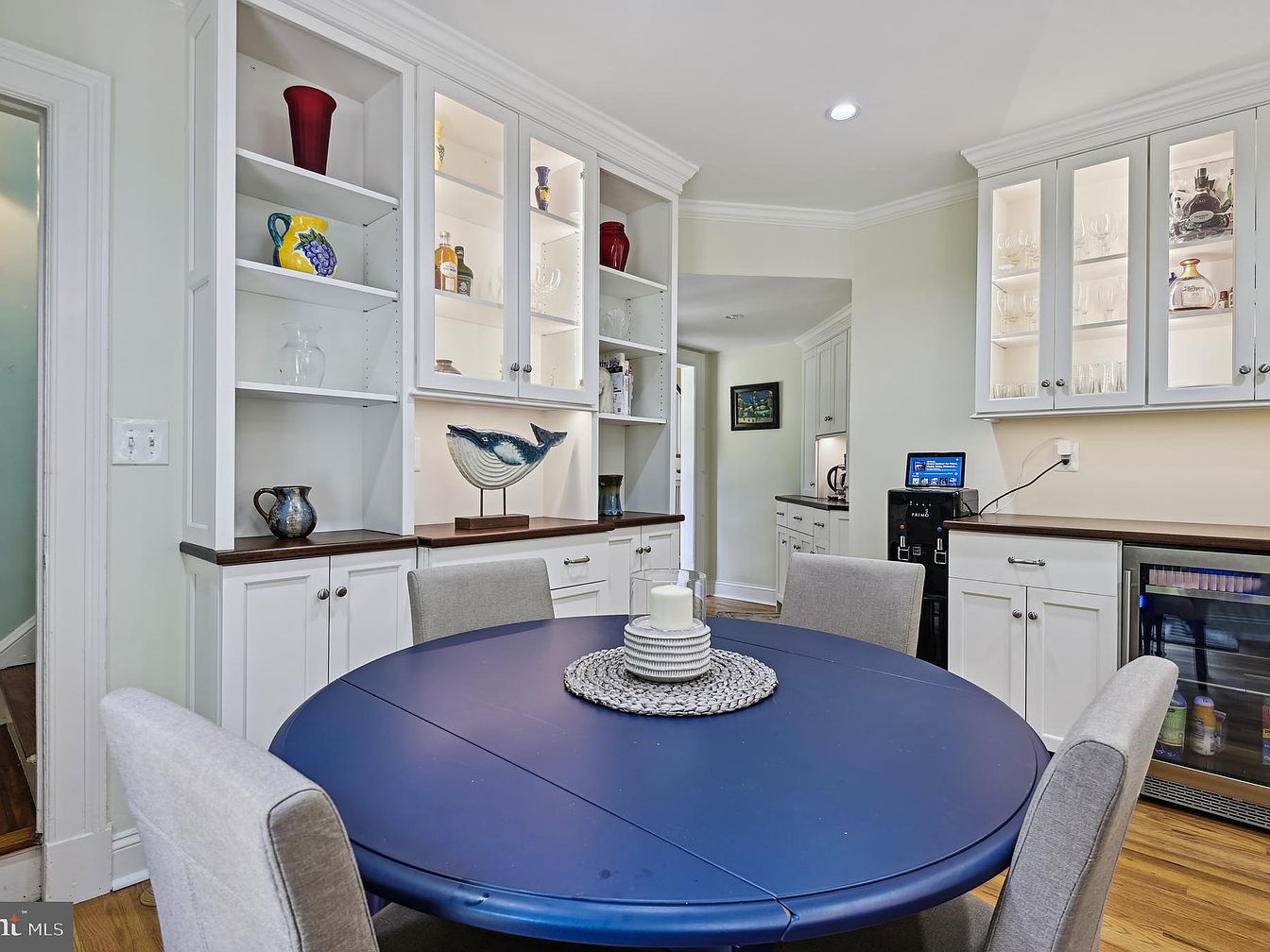 This charming dining area showcases a round navy table surrounded by plush beige chairs, perfect for family meals. Light pours in from recessed ceiling lights, illuminating custom cabinetry with glass doors that display colorful glassware and decorative ceramics. The warm wooden countertops add a rustic touch, complementing the soft neutral color palette of the walls. A subtle maritime theme is introduced with an artistic whale sculpture, enhancing the coastal feel. Conveniently positioned next to a modern beverage cooler, this space is ideal for entertaining, creating inviting gatherings in a cozy yet sophisticated setting.