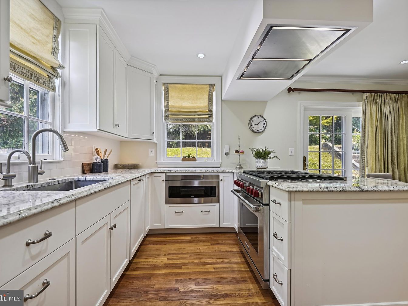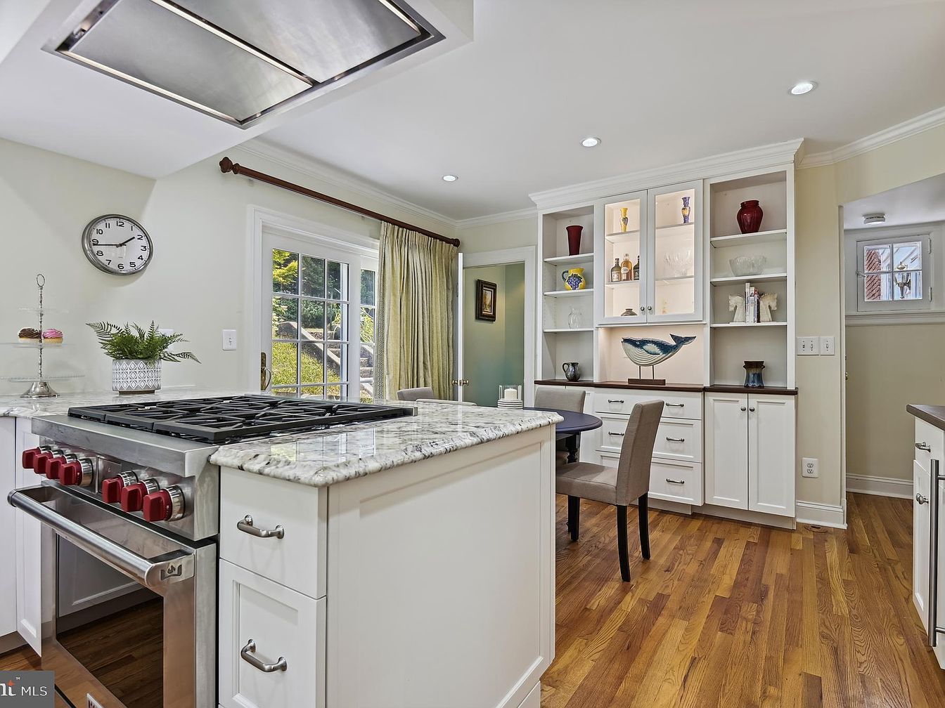 This modern kitchen features a spacious and open layout, ideal for family gatherings and culinary creativity. A stunning granite countertop complements sleek white cabinetry, creating a clean and inviting atmosphere. The central island showcases a high-end gas range with eye-catching red knobs, ensuring both style and functionality. Ample natural light floods in through double French doors, leading to a scenic outdoor space that blends indoor and outdoor living. Thoughtfully placed recessed lighting brightens the area while a decorative display cabinet elegantly showcases collectibles. The warm wood flooring adds a touch of cozy charm, perfect for family meals and entertaining.