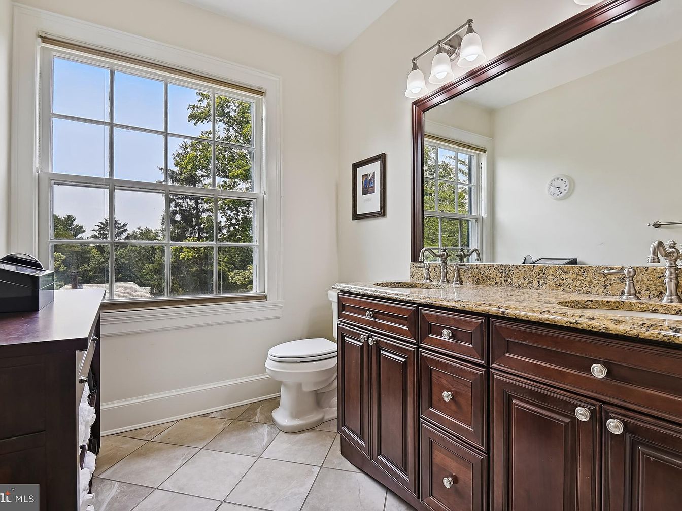 This serene bathroom suite features a well-thought-out layout, integrating functionality with elegance. Rich mahogany cabinetry contrasts beautifully with the light granite countertops, providing ample storage and a touch of luxury. Dual sinks offer convenience for busy mornings, while the large window invites natural light, enhancing the airy feel. The neutral color palette promotes calmness, complemented by soft earth-toned tiles underfoot, ensuring a cohesive aesthetic. Family-friendly elements include easy-to-clean surfaces and a spacious design that accommodates movement. The framed artwork adds a personal touch, while modern fixtures bring in a contemporary flair, creating a perfect sanctuary for relaxation.