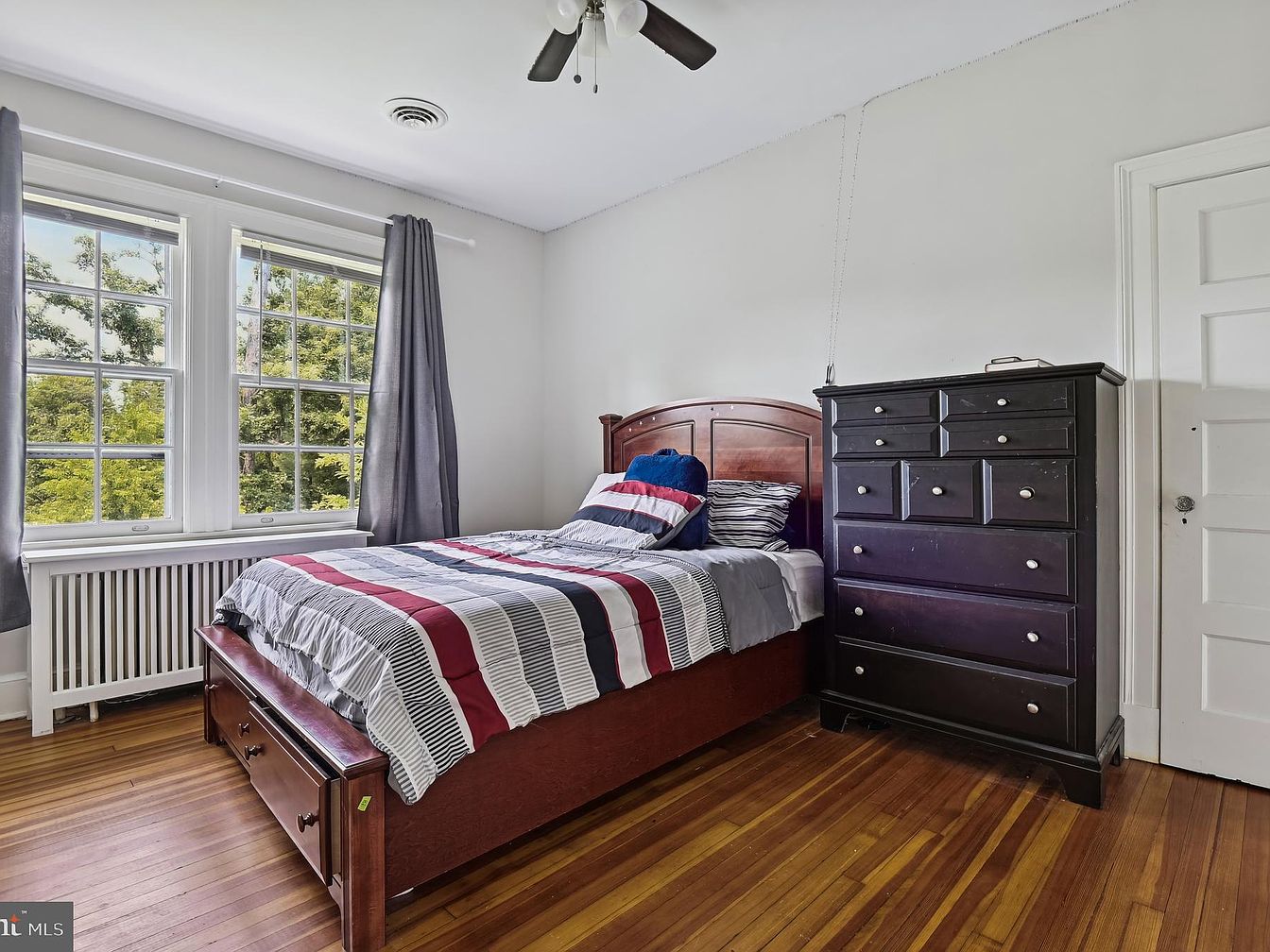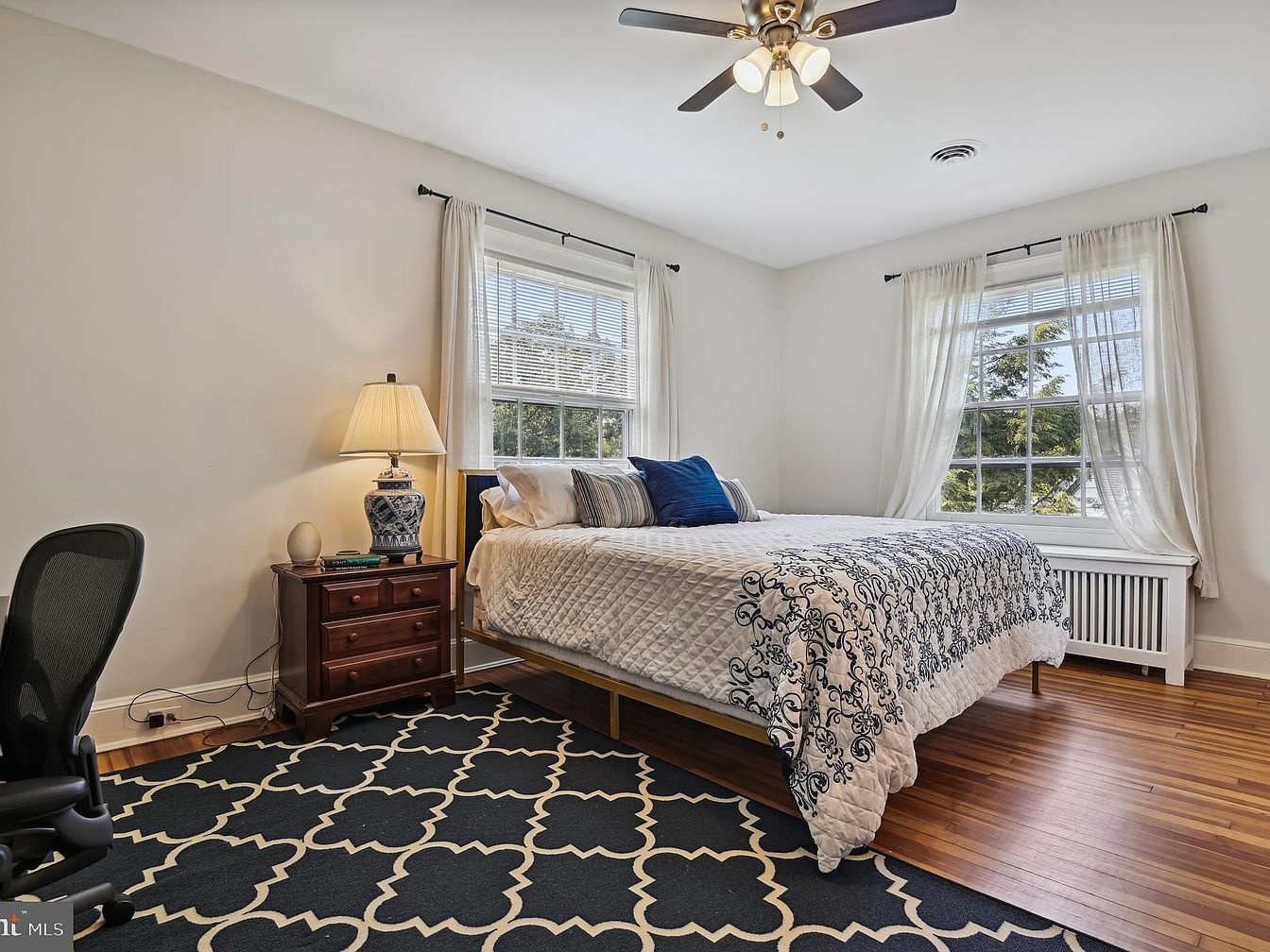 This serene bedroom features a harmonious blend of comfort and style, ideal for restful nights. The warm hardwood floors complement the intricate navy and white area rug, adding a modern touch to the classic design. A plush bed dressed in a crisp, quilted coverlet is flanked by elegant bedside tables, providing essential storage and decorative flair. Natural light floods the space through large windows, adorned with sheer curtains that gently diffuse the sunlight. A decorative lamp casts a warm glow, while the ceiling fan offers a refreshing breeze, making this cozy retreat perfect for relaxation or a quiet day of reading.