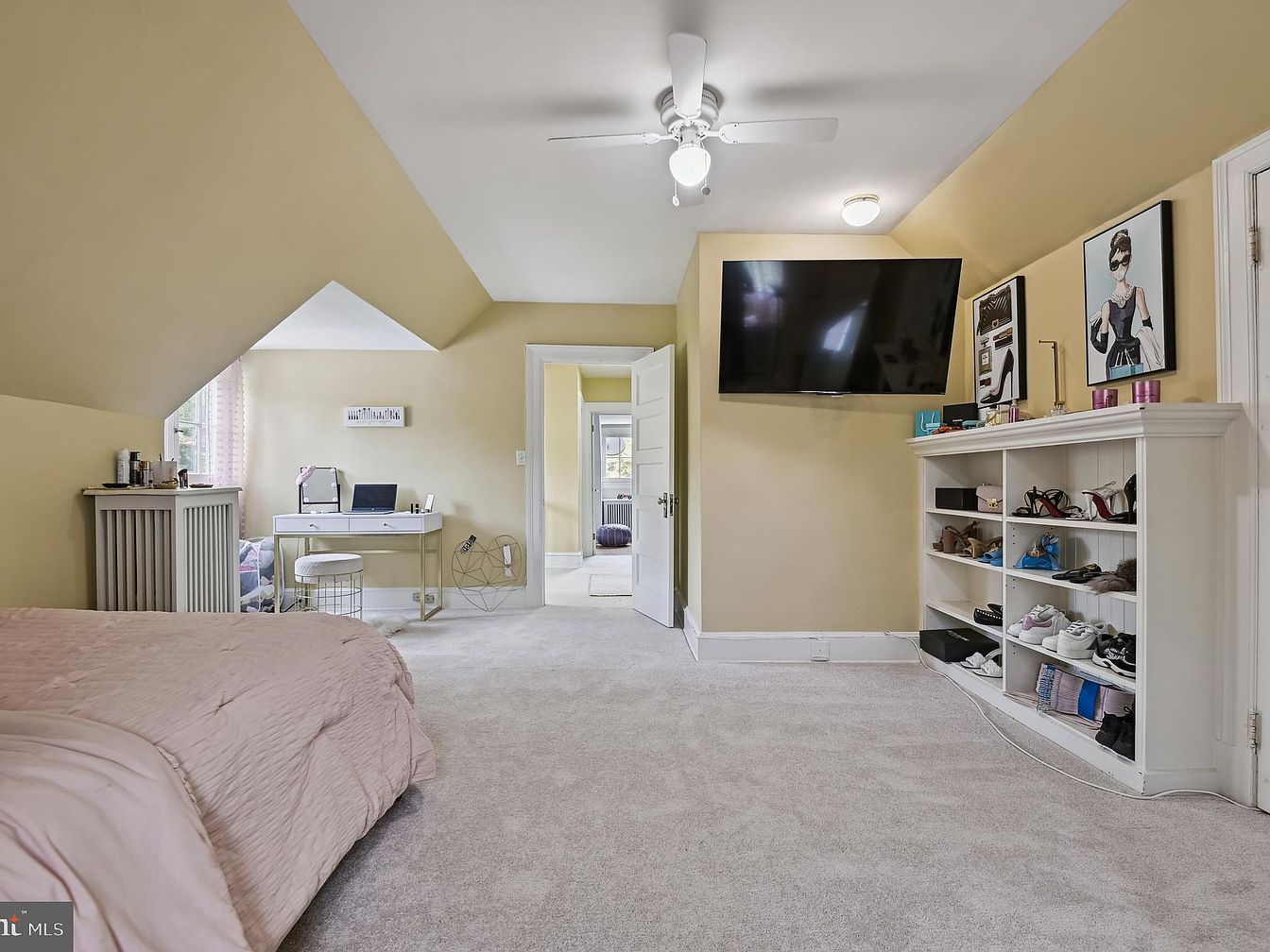 This charming bedroom features a warm, inviting design with gentle yellow walls that create a cozy atmosphere. The pitched ceiling enhances the spacious feel, while natural light streams through the window, illuminating a cozy reading nook by the radiator. A soft, blush-colored duvet on the bed complements the light-hued, plush carpeting underfoot. Modern furniture, including a sleek desk and a stylish display shelf, adds functionality without sacrificing elegance. A wall-mounted television provides entertainment, making this space perfect for relaxation. Stylish artwork and organized shelves showcase personal touches, enhancing the room’s family-friendly, personalized appeal.