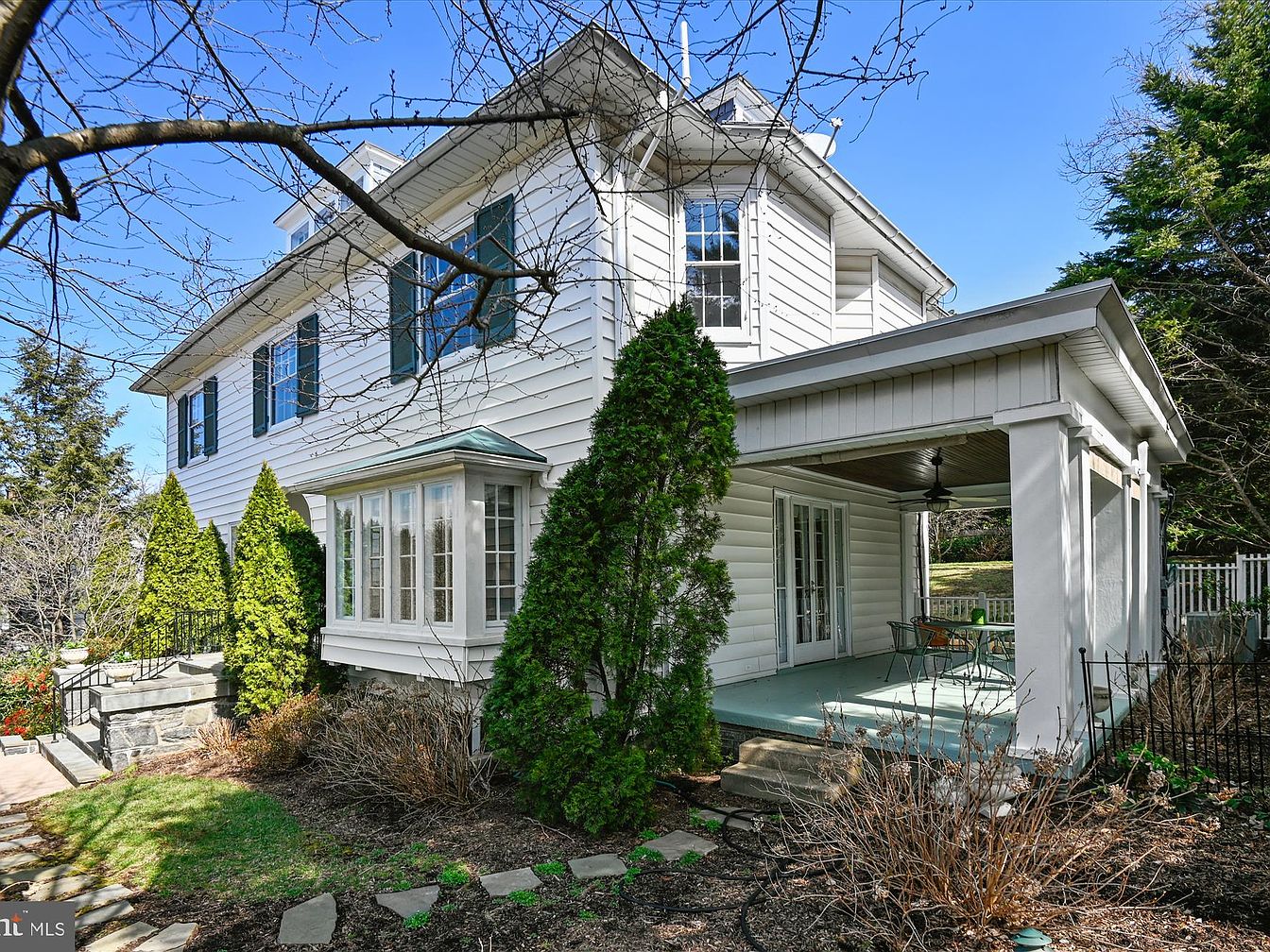 This enchanting porch area features a blend of classic design and modern comfort. Adorned with large windows, the space invites ample natural light, enhancing its warm, welcoming atmosphere. The light green flooring complements the white siding, while matching shutters frame the windows, adding a coherent color scheme. A cozy seating arrangement awaits, perfect for family gatherings or quiet evenings. Lush greenery flanks the entrance, leading up to the stone steps and creating a tranquil escape. The architectural details, including the ceiling fan and elegant columns, reflect a commitment to both style and functionality, making it a perfect family-friendly retreat.