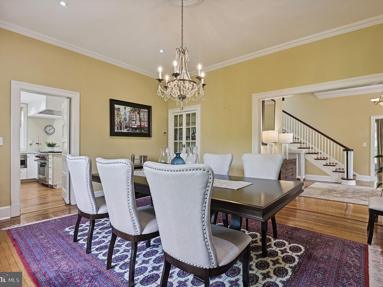 The dining room features an elegant blend of classic charm and modern comfort. A long dark wooden table is surrounded by plush upholstered chairs, providing ample seating for family gatherings. The soft beige walls enhance the space’s warmth, complemented by the intricate crown molding. A striking chandelier hangs overhead, illuminating the room with a soft glow, while a vibrant area rug adds a splash of color and texture beneath the table. Large doorways lead to the kitchen and living areas, creating an inviting flow throughout the home. This space is perfect for both entertaining and intimate family dinners.