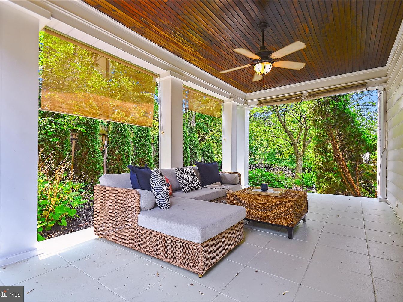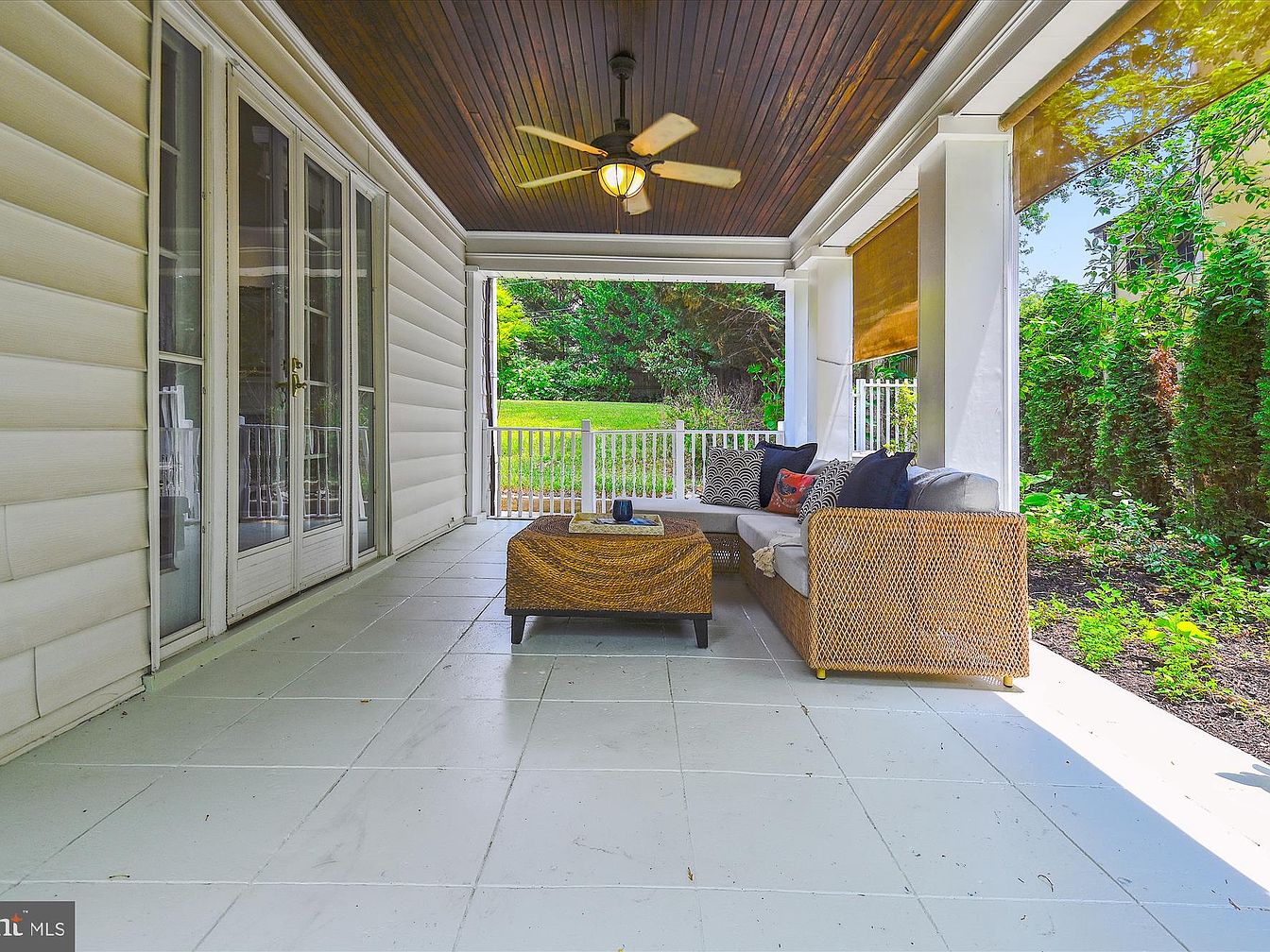 This inviting covered patio exudes warmth and comfort, making it an ideal outdoor retreat. Featuring a rustic ceiling with exposed beams, the space seamlessly connects indoor and outdoor living. The light-colored tiled floor enhances the airy feel, complemented by stylish wicker furniture adorned with plush, patterned cushions in rich hues. Natural light streams through large, glass doors, showcasing lush greenery beyond the white picket fence. A ceiling fan provides a refreshing breeze, ensuring the space remains family-friendly and suitable for year-round enjoyment. This patio invites relaxation, perfect for gatherings or quiet mornings with a coffee.