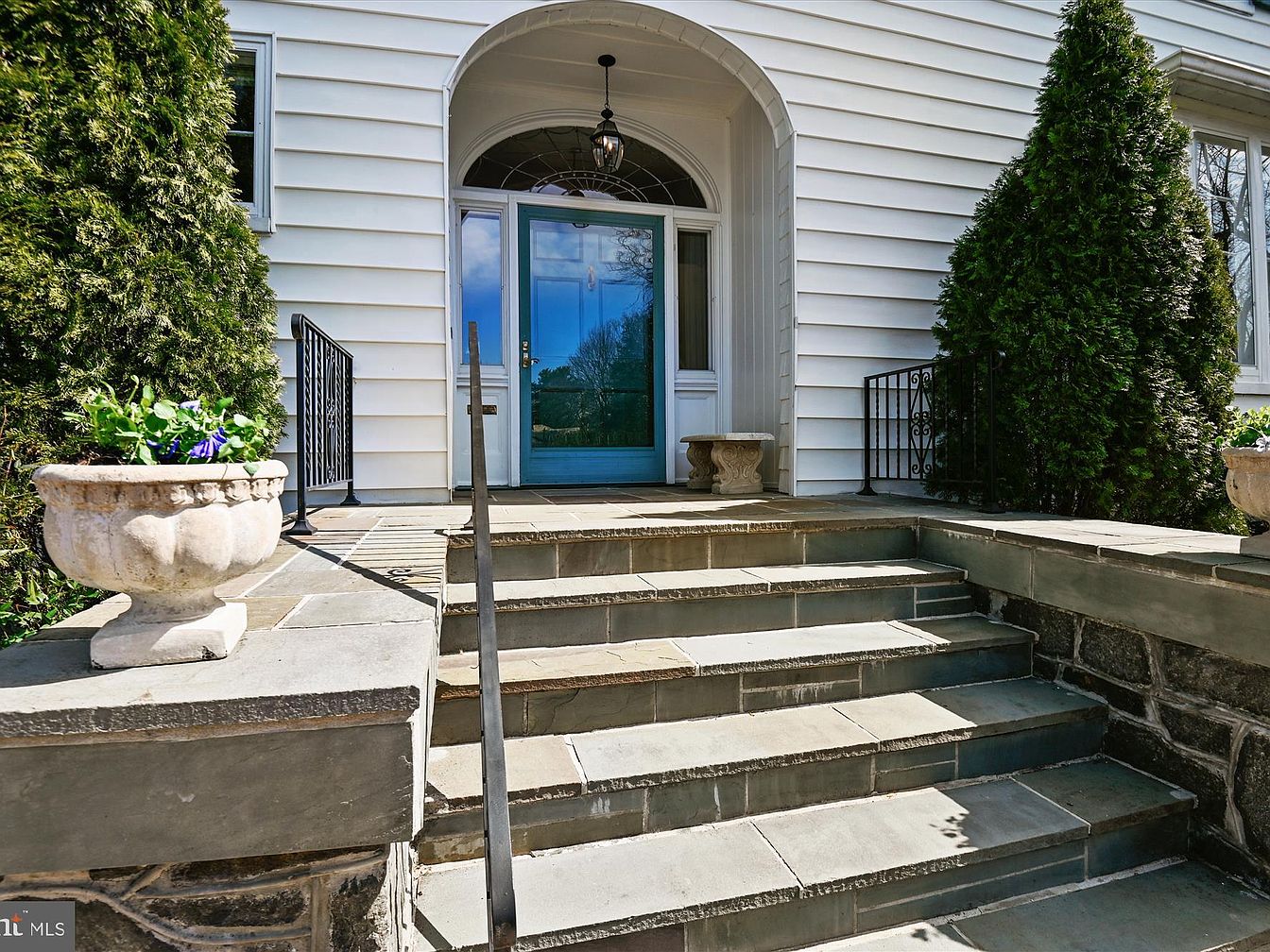 Welcoming and beautifully crafted, this home’s front entrance features a charming arched doorway framed by elegant siding and lush greenery. The light blue front door enhances the inviting atmosphere, while large polished stone steps create a sturdy yet attractive entryway. Ornamental planters with vibrant flowers add a touch of color and life. The surrounding landscaping includes meticulously trimmed evergreen bushes, ensuring a neat and appealing look. Architectural details like wrought iron railings provide both safety and sophistication. Ideal for family gatherings, this entrance conveys warmth and elegance, setting a picturesque tone for all who enter.