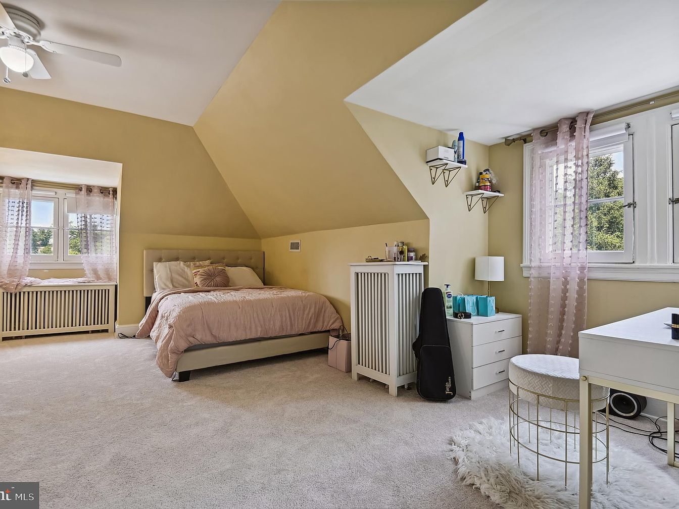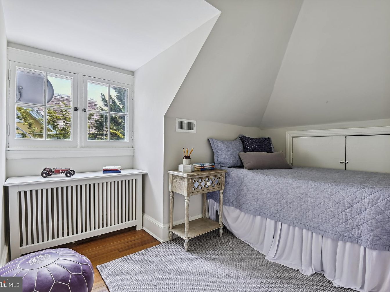 This charming bedroom nook features a slanted ceiling, enhancing the room’s cozy atmosphere. Natural light pours through the picturesque double windows, illuminating the soft gray and lavender color palette. A neatly made twin bed, adorned with textured pillows, invites relaxation, while a decorative side table adds both functionality and elegance. Situated beside a bright radiator cover, a playful toy car adds a whimsical touch. The space is adorned with a plush, light-hued area rug and a soft ottoman, creating a family-friendly environment. Thoughtfully designed for comfort, this nook effortlessly blends style with practicality, making it a perfect retreat.