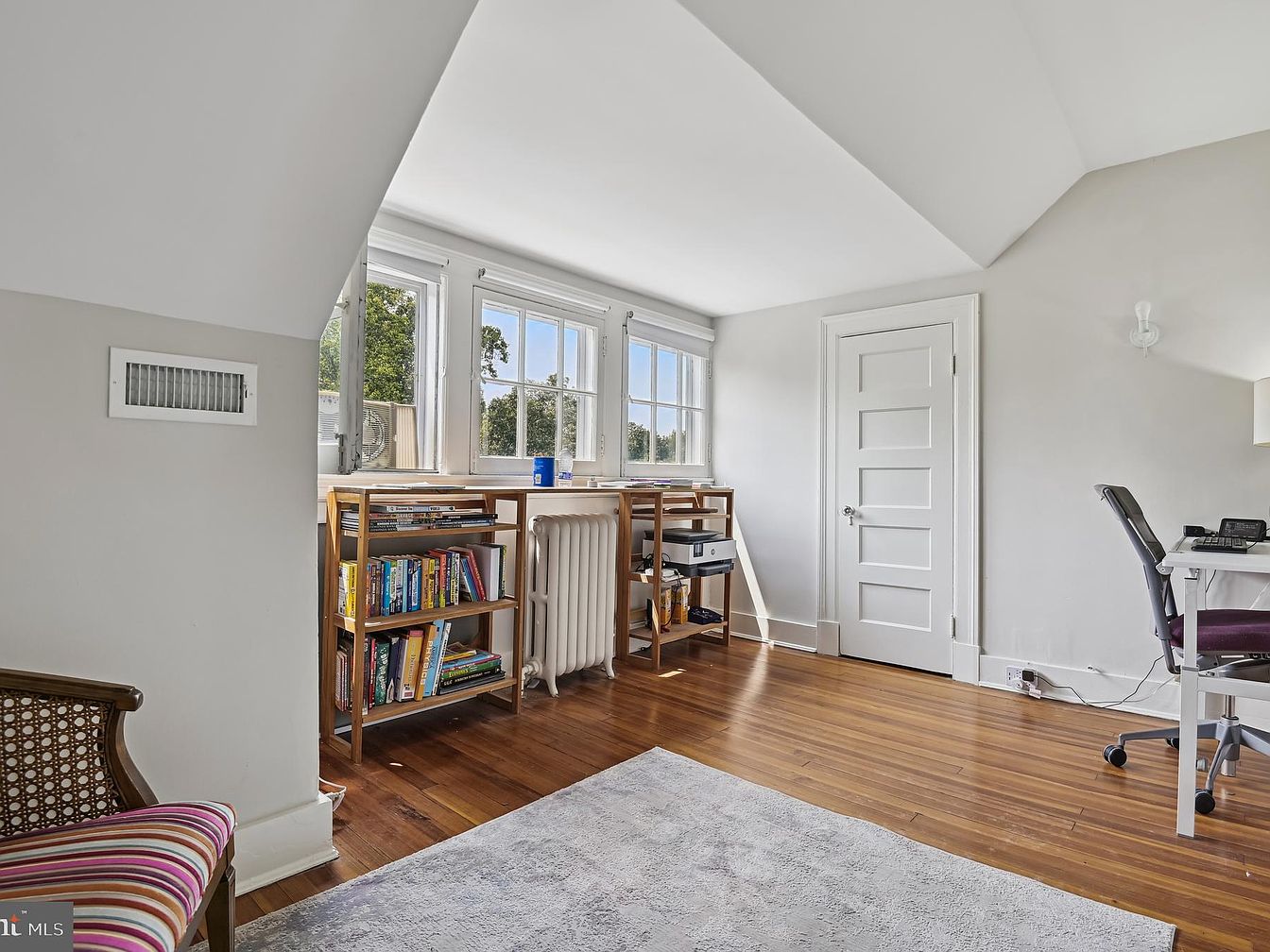 This inviting home office boasts a spacious layout with hardwood flooring, which adds warmth and elegance. Natural light floods the room through large windows, creating a bright, cheerful atmosphere ideal for productivity. A stylish bookshelf filled with colorful books adds a touch of personality and encourages reading. The minimalist desk setup complements the overall clean aesthetic, featuring a modern chair for comfort. Architectural details such as the sloped ceiling enhance the character of the room, while a neutral color palette ensures a calm ambiance. Thoughtfully placed storage options promote an organized environment, making it a perfect family-friendly workspace.