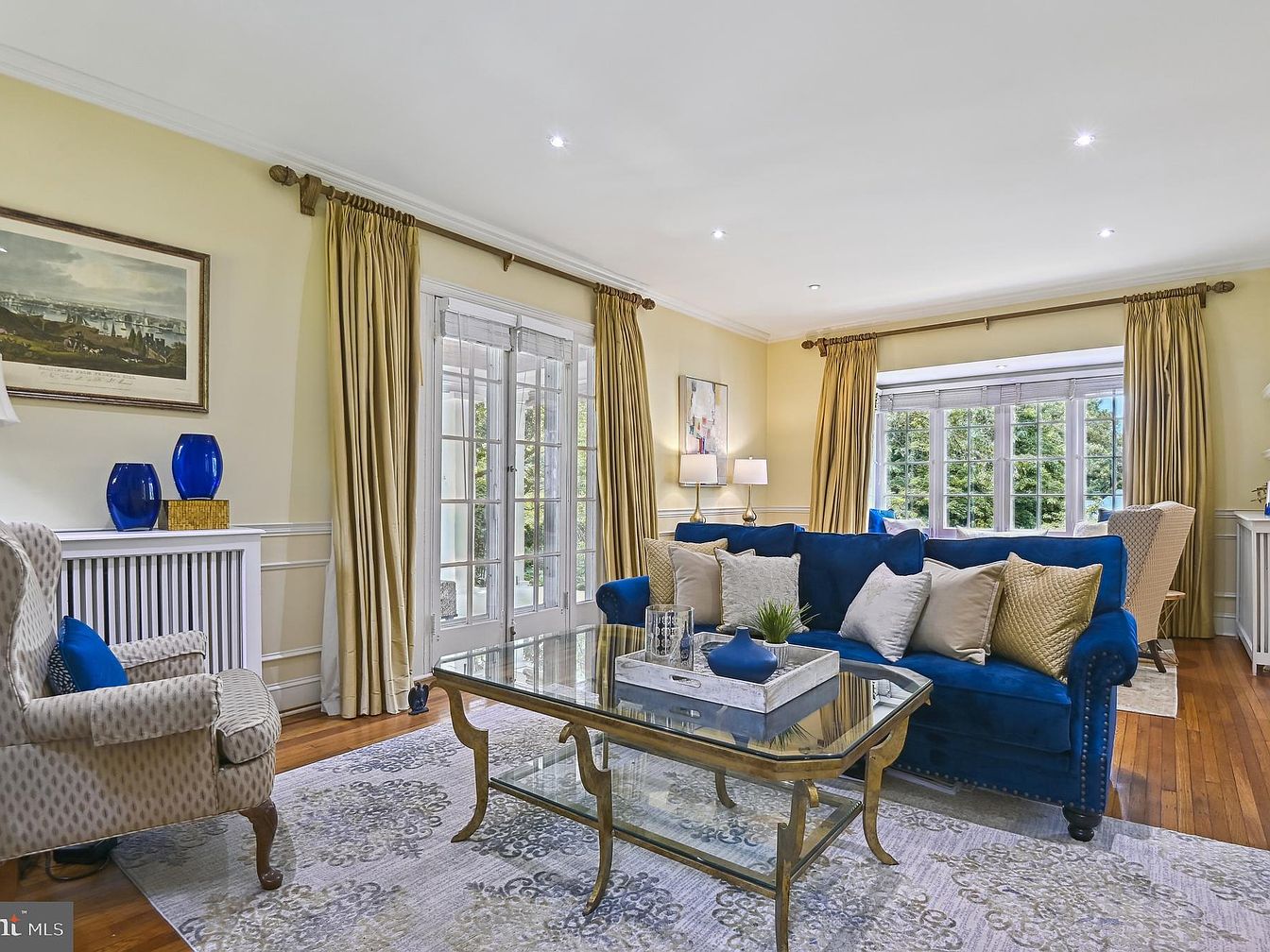 This inviting living room combines traditional charm with modern aesthetics. The rich, blue couch provides a striking contrast against soft beige walls, while the elegant, patterned area rug complements the warm wooden flooring. Natural light floods the space through expansive windows, framed by luxurious gold curtains that enhance the room’s brightness. A glass coffee table serves as a focal point, highlighting decorative elements like vibrant vases and a subtle greenery piece. Cozy armchairs invite family gatherings, and the carefully selected artwork on the walls adds character. Attention to detail in moldings and trim emphasizes the home’s sophisticated design.