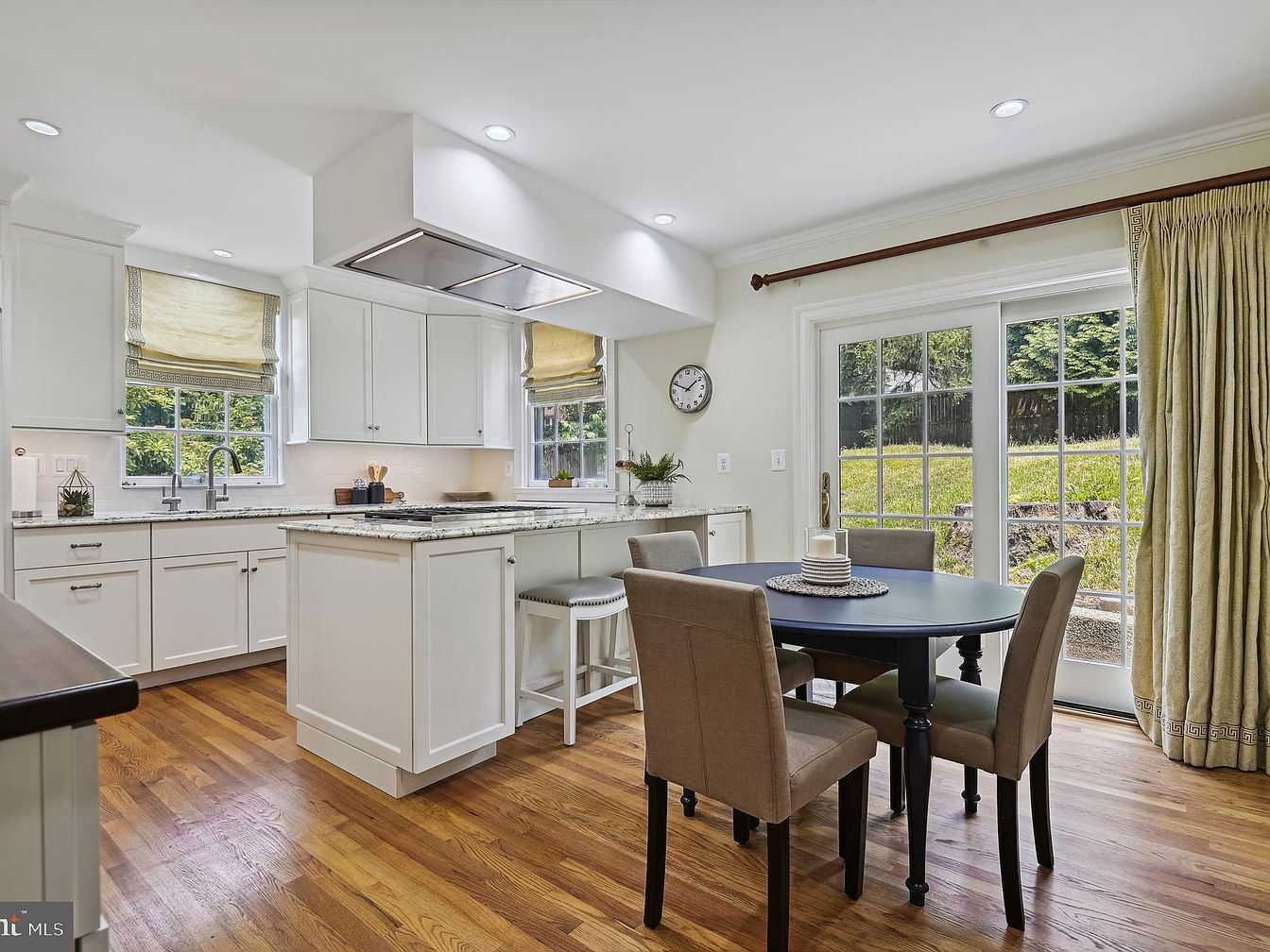 This inviting kitchen combines style and functionality, featuring an open layout that enhances family interaction. The crisp white cabinetry, paired with a sparkling granite countertop, creates a timeless aesthetic, while the warm hardwood flooring adds warmth and texture. Ample natural light floods the space through large windows outfitted with elegant shades, ensuring a bright atmosphere for meal prep or gatherings. A cozy dining area is seamlessly integrated, showcasing a circular table surrounded by upholstered chairs, making it ideal for casual family meals. Modern appliances and thoughtful details complete this sophisticated yet welcoming kitchen, perfect for everyday living.