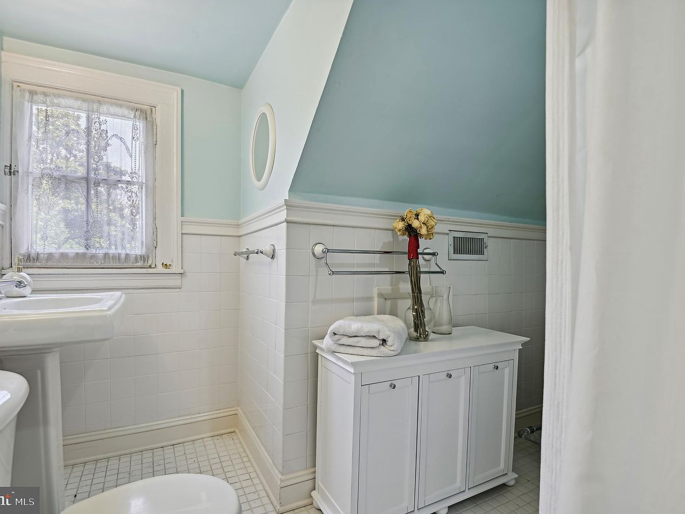 This inviting bathroom features a lovely blend of vintage charm and modern functionality. The soft blue accent wall complements the crisp white tiles, creating a serene atmosphere. A quaint window adorned with delicate lace curtains allows natural light to filter in, enhancing the airy feeling of the space. The porcelain sink and classic fixtures, including a convenient towel bar, are both stylish and practical. A stylish white storage cabinet neatly houses towels and toiletries, maintaining organization. The sloped ceiling adds character, while the overall color scheme promotes tranquility, making this space perfect for relaxation and family use.