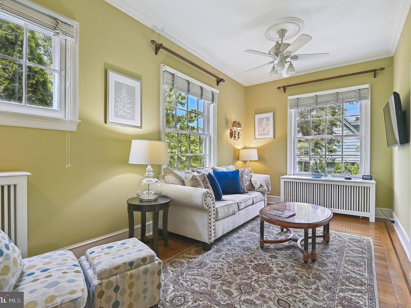 This inviting living room features soft green walls that create a warm atmosphere, enhanced by abundant natural light streaming through large windows. A plush beige sofa adorned with blue and neutral throw pillows provides a comfortable seating area, perfect for family gatherings. Accompanying it is a round coffee table on a beautifully patterned area rug, offering a touch of elegance. The room is illuminated by a stylish ceiling fan and wall sconces, emphasizing its cozy charm. Decorative artwork adds personality, while a vintage radiator and thoughtfully placed greenery contribute to a family-friendly, serene environment.