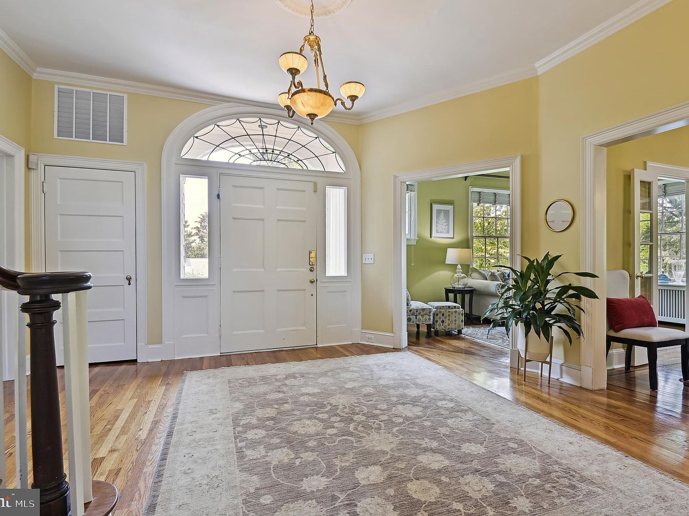This inviting entryway features warm yellow walls, creating a cheerful first impression. The spacious layout boasts durable hardwood flooring, complemented by a chic area rug that adds a touch of sophistication. A beautiful arched window illuminates the space, while classic double doors frame the entrance. Architectural details include crown molding and a decorative chandelier that enhances the aesthetic. To the side, a leafy houseplant and a cozy seating nook encourage relaxation, making this space perfect for families and guests alike. The adjacent rooms are visible, hinting at a cohesive flow throughout the home, balancing style and comfort seamlessly.