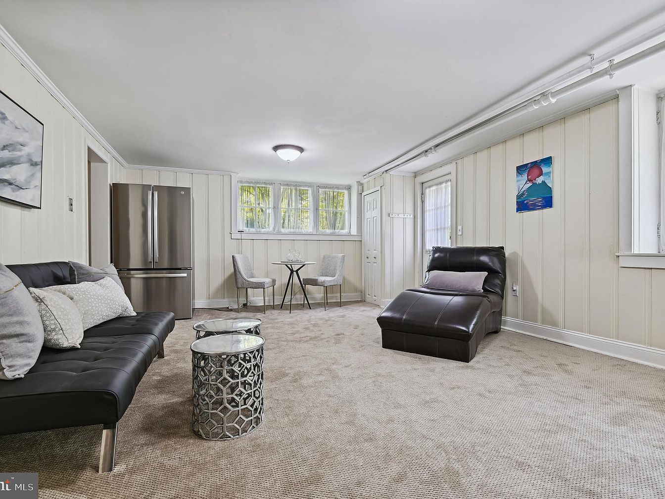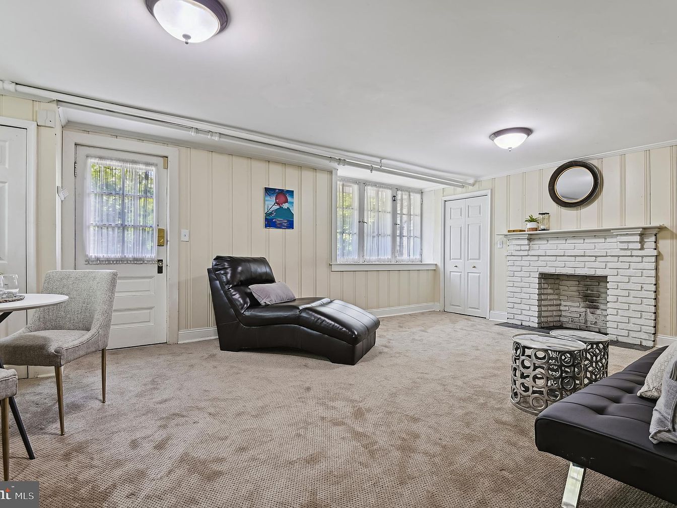 This inviting living room features a comfortable layout perfect for family gatherings. The soft beige carpet complements the light-colored paneling on the walls, creating a warm and welcoming atmosphere. A sleek black chaise lounge adorned with a plush cushion invites relaxation, while the stylish black sofa with elegant accents provides ample seating. Natural light pours in from the large windows, enhancing the room’s airy feel. The charming white brick fireplace serves as a focal point, topped with tasteful decor, including a mirror and greenery. A round dining table offers a cozy nook for casual meals and conversations.