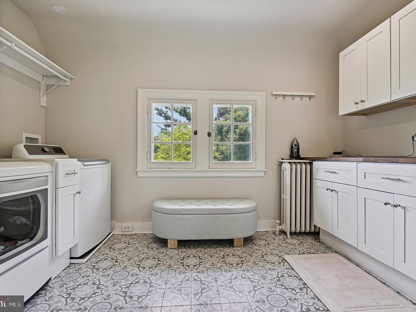 This functional laundry room features a clean, modern design that emphasizes efficiency. The bright white cabinetry beautifully contrasts with the ornate gray and white tiled flooring, creating a visually appealing focal point. Natural light floods the space through the charming window, enhancing the inviting atmosphere. A compact, cushioned bench provides a convenient spot for folding clothes and adds a touch of comfort. With ample storage in cabinets above the washer and dryer, the room maintains an organized appearance. The stylish radiator further complements the space, ensuring warmth and functionality, making laundry chores feel less daunting.