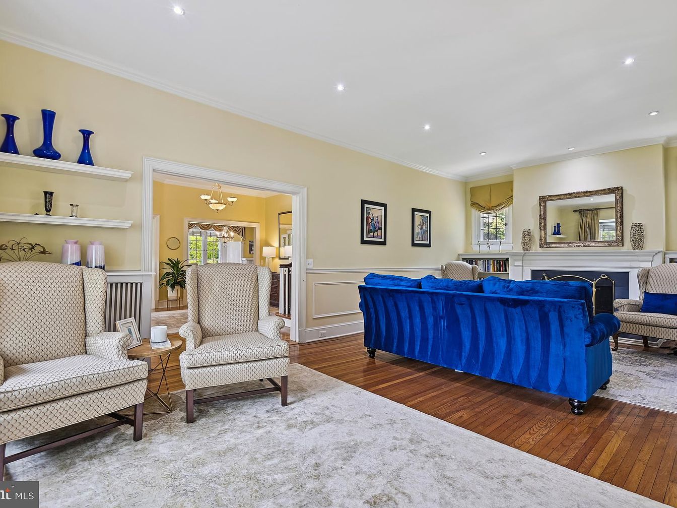 This inviting living room features a harmonious blend of comfort and elegance, showcasing a plush blue sofa that acts as a vibrant focal point against a backdrop of warm beige walls. Flanking the sofa are two stylish armchairs, providing ample seating for family gatherings. The hardwood flooring adds warmth, while a soft area rug anchors the space. Detailed crown molding enhances the architectural charm, and tasteful artwork adorns the walls. Natural light streams in through large windows, creating a bright and airy atmosphere, perfect for relaxation and family bonding. Stylish accents like vases and decorative shelves complete the inviting ambiance.