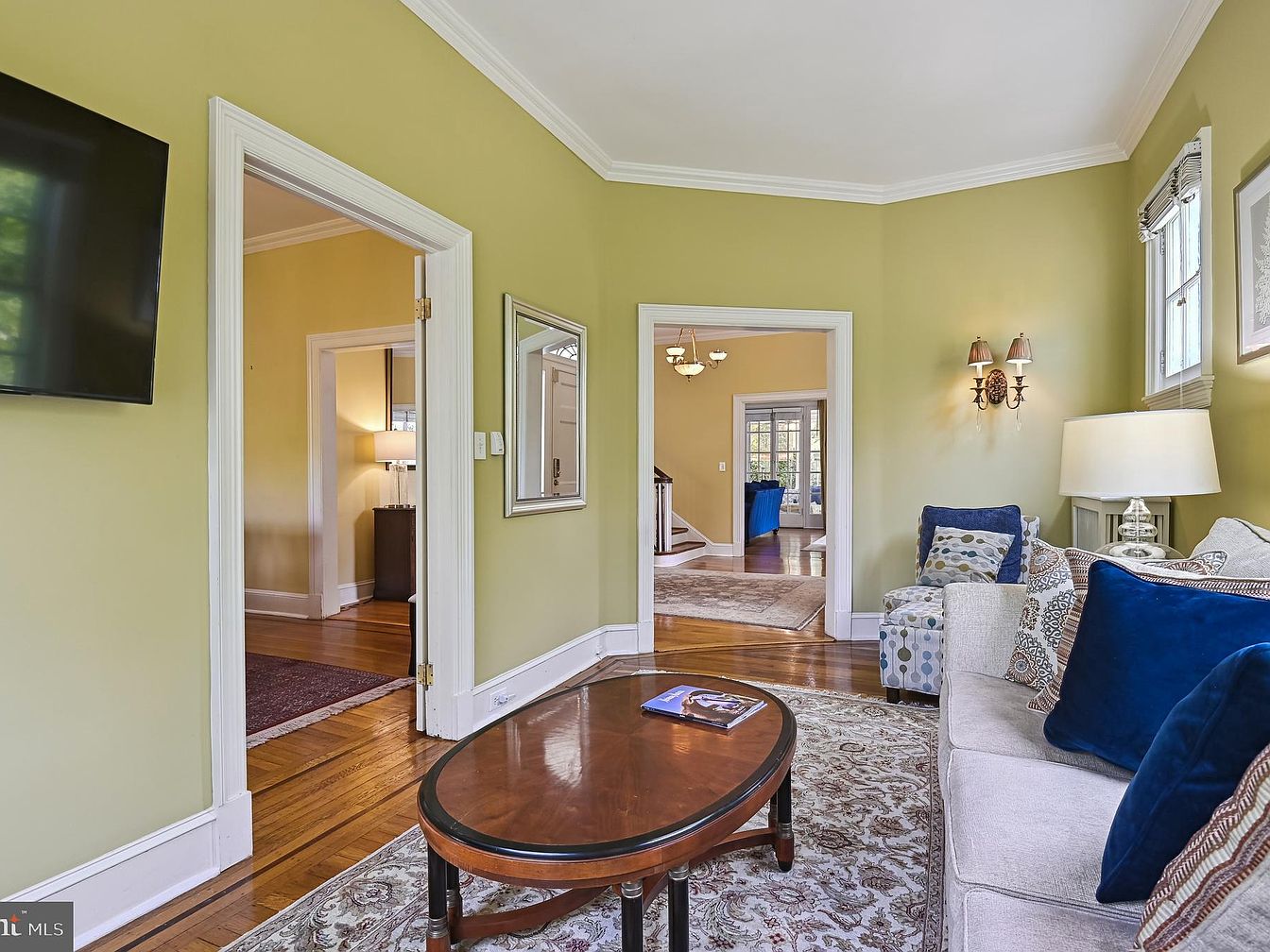 This inviting living room features a warm, soft green hue on the walls, creating a cozy atmosphere. Elegant crown molding frames the ceiling, accentuating the room’s classic architecture. A plush sectional sofa adorned with decorative pillows complements the polished hardwood floors. A stylish coffee table rests on a decorative area rug, adding textures and patterns that enhance the room’s comfort. Wall sconces provide gentle lighting, while a flat-screen TV becomes a focal point for entertainment. The open layout invites natural light through multiple windows, showcasing the home’s welcoming ambiance ideal for family gatherings.