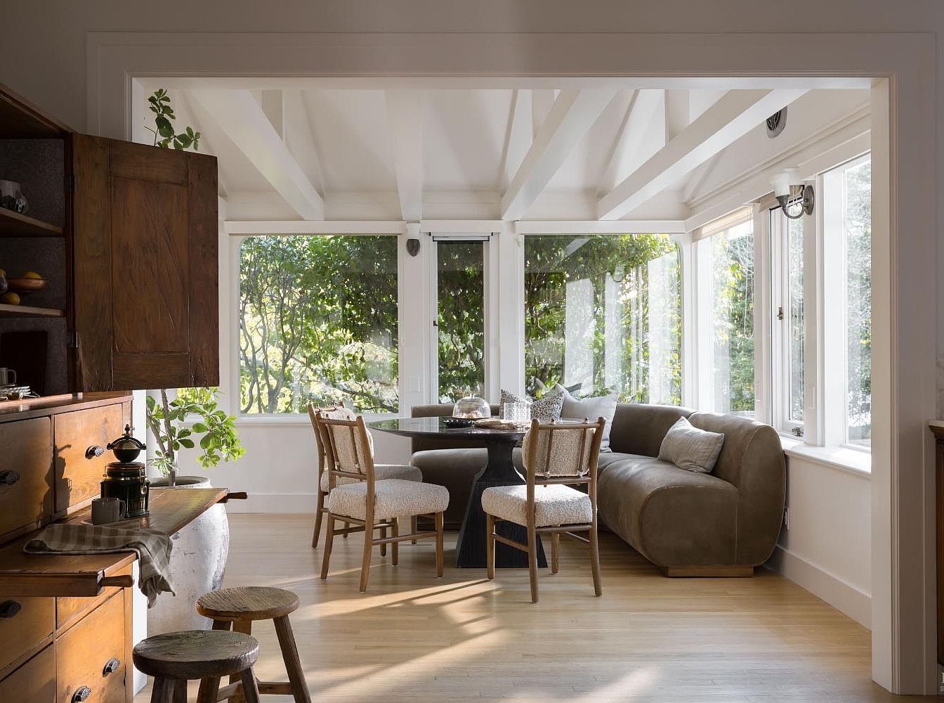 This inviting dining area features a blend of contemporary and rustic elements, highlighted by large windows that invite natural light and vibrant greenery indoors. A sleek, round black table serves as the centerpiece, complemented by four cushioned, light-toned chairs that enhance comfort for family gatherings. A plush, curved sofa provides additional seating, ideal for casual dining or leisurely coffee breaks. The warm wooden flooring pairs harmoniously with the soft, neutral color palette, while exposed beams overhead add a touch of architectural interest. The space embodies a cozy yet spacious feel, perfect for family meals and entertaining.