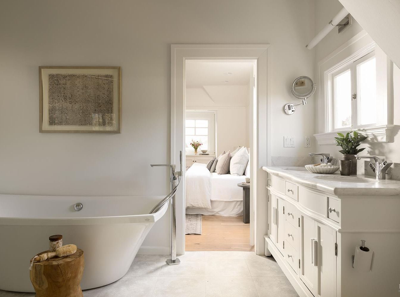 This elegantly designed bathroom features a spacious freestanding tub that invites relaxation, complemented by a chic wooden stool. The soothing, light gray walls create a serene atmosphere, while the white cabinetry and marble countertop exude luxury and functionality. Ample storage is provided by the drawers beneath the sink, ensuring a clutter-free space. A bright doorway leads to a cozy bedroom, adding warmth and accessibility to this family-friendly layout. Natural light streams through the windows, illuminating tasteful decor and enhancing the calm color palette. Modern fixtures and thoughtful details make this bathroom a perfect retreat.