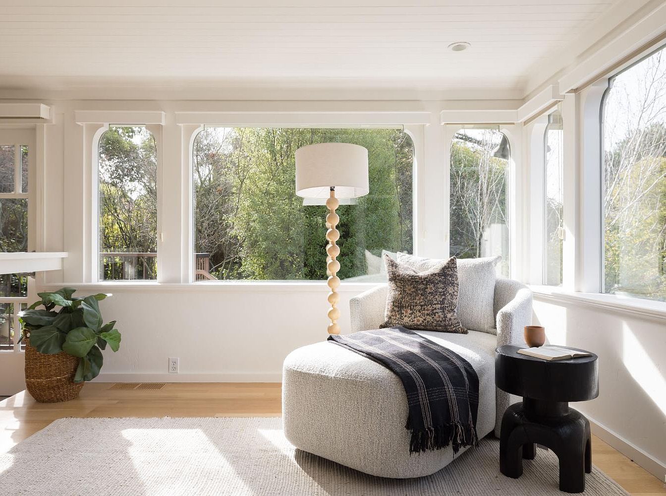 This inviting reading nook features an oversized, curvy lounge chair adorned with textured cushions, creating a perfect retreat for relaxation. The warm color palette incorporates soft whites and earthy tones, harmonizing with the natural light flooding through expansive windows that offer serene views of surrounding greenery. A unique, bead-accented floor lamp adds playful elegance, while a small black side table complements the space, perfect for holding a warm drink or a favorite book. The light hardwood flooring enhances the airy ambiance, making this nook a harmonious blend of comfort and modern design, ideal for family gatherings or quiet moments.