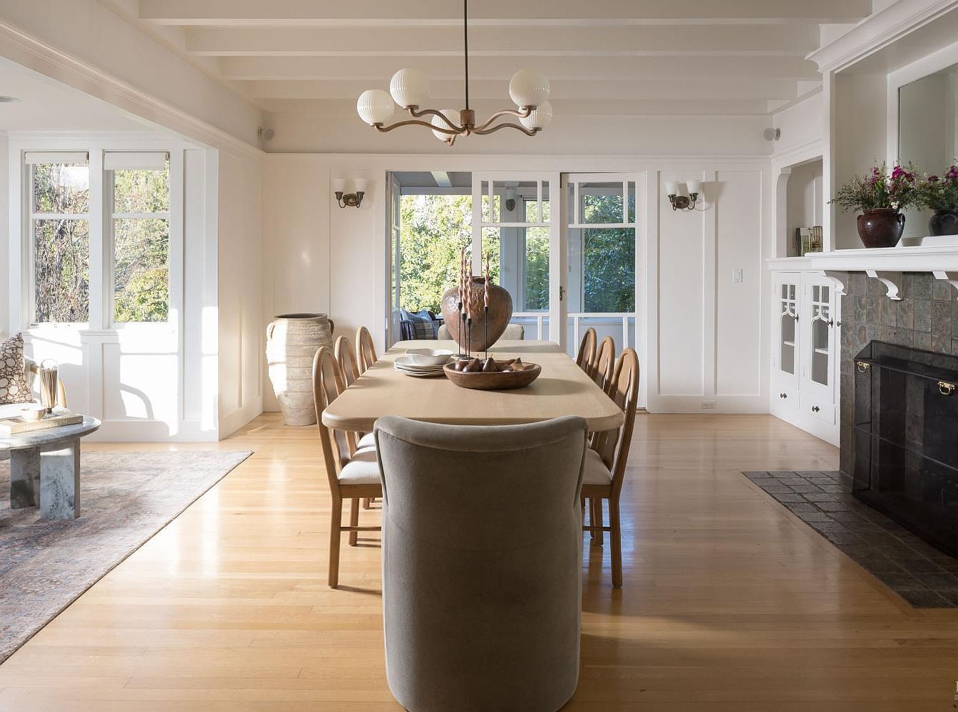 A spacious dining room features a long, inviting table surrounded by a mix of wooden and upholstered chairs, ideal for family gatherings. Natural light pours in through the expansive windows, highlighting the warm, light hardwood flooring and soft cream walls that create a welcoming atmosphere. An eye-catching chandelier elegantly hangs from the beamed ceiling, adding a touch of sophistication. The room blends modern design with rustic elements, as seen in the charming stone fireplace and the decorative ceramic vases. Thoughtfully arranged decorative bowls on the table enhance the space’s warmth, perfect for lively meals and intimate conversations.