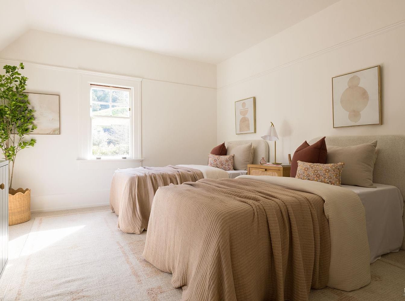 This cozy kid’s bedroom features two inviting twin beds, accentuated by soft, neutral bed linens and textured blankets that invite restful nights. The sloping ceiling heightens the space, framing large, light-filled windows that usher in warmth. Soft earth tones dominate the color palette, complemented by colorful decorative pillows, adding a playful touch. A delicate potted plant adds a breath of fresh air, while understated artwork enhances the tranquil ambiance. Functional touches like a bedside lamp and organized storage harmonize comfort with practicality, making it an ideal sanctuary for siblings or guests in a family-friendly home.