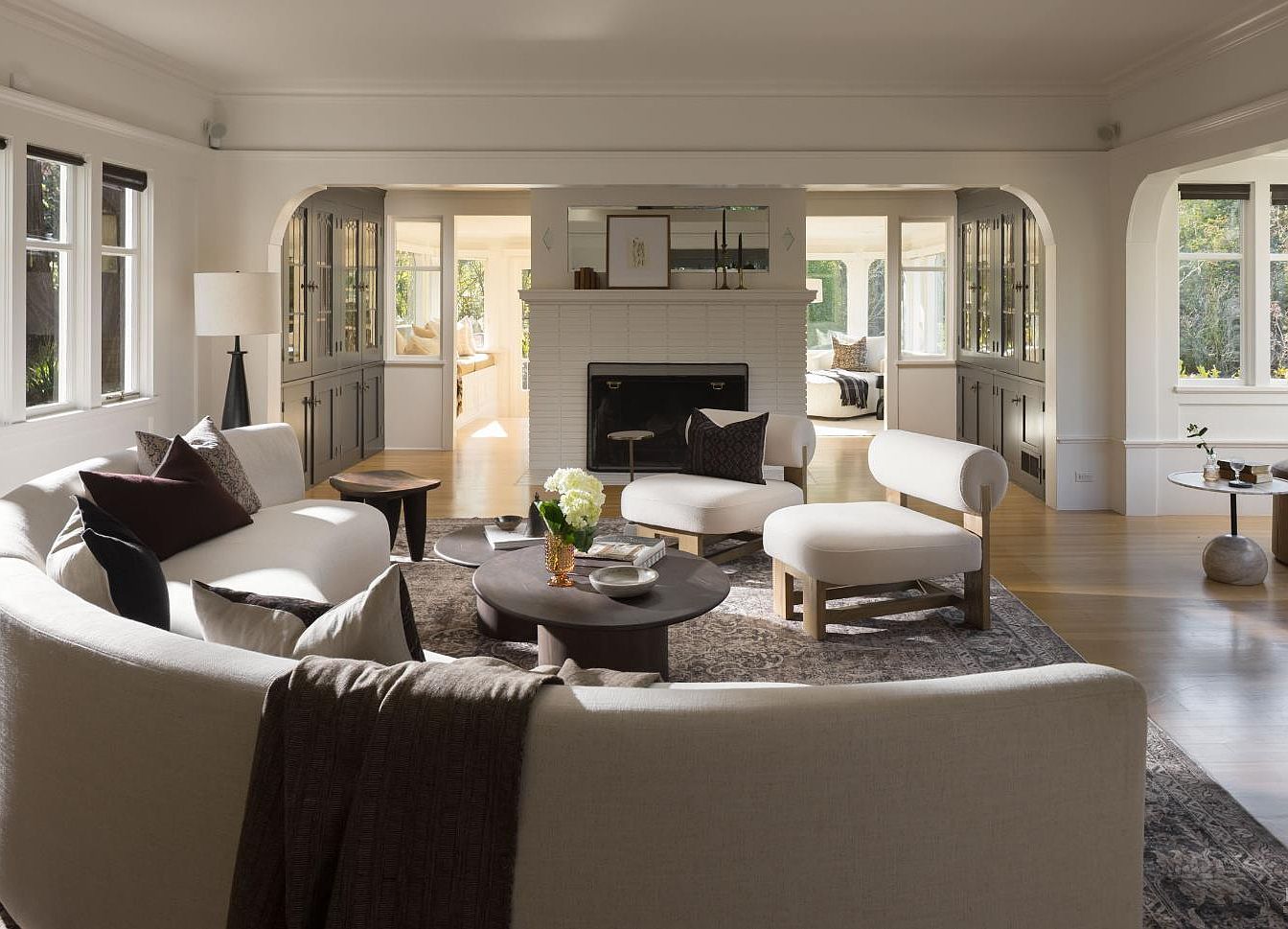 This inviting living room features a spacious and airy layout with soft, neutral tones that enhance its welcoming atmosphere. A curved, plush sectional in light fabric harmoniously complements elegant accent chairs, creating a cozy gathering spot. The rich, dark wood accents, including the low tables, add warmth, while the chic area rug contributes texture. Natural light floods through expansive windows, connecting the indoor space to the lush outdoors. The fireplace, adorned with white tiles, serves as a striking focal point. Stylish decor elements, including a mix of decorative pillows and tasteful floral arrangements, enrich the overall family-friendly ambiance.